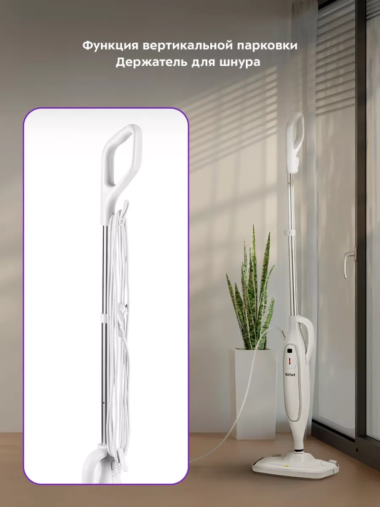 Паровая швабра обладает функцией вертикальной парковки и большим углом наклона при уборке, который поможет легко убирать пространство под мебелью. Напольная щетка закреплена на специальном шарнире с наклоном в двух плоскостях, что делает швабру очень маневренной и облегчает процесс уборки. На рукоятке и корпусе устройства предусмотрены держатели для шнура.