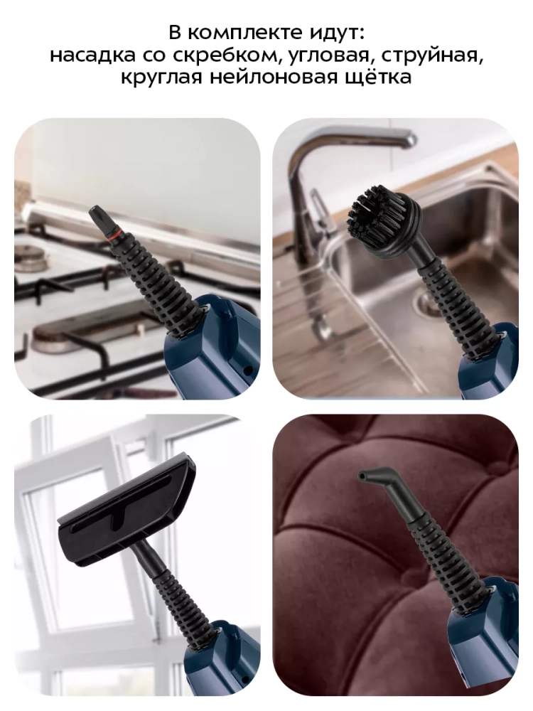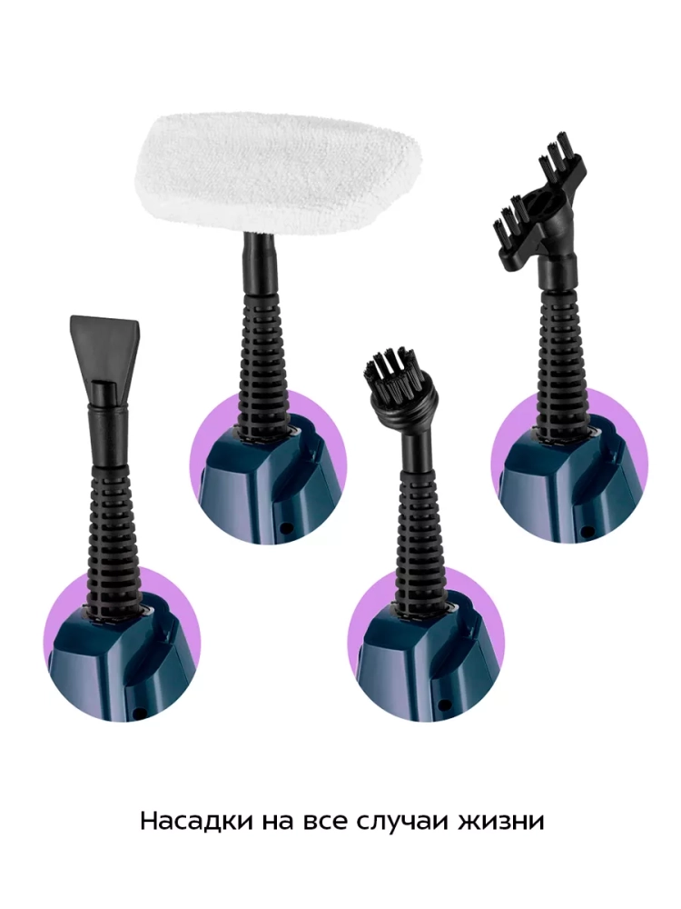 Конструкция «2 в 1» предусматривает использование ручного модуля паровой швабры с насадками без присоединения к нему удлинительной трубки с рукояткой. Большое количество насадок в комплекте поможет очистить труднодоступные или сильнозагрязненные поверхности. Скребок и нейлоновые щетки эффективно очищают сложные загрязнения с помощью механического воздействия. Для очистки окон, зеркал и кафельной плитки используется насадка с резиновым скребком. Струйная и угловая насадки помогут очистить щели и углы. С помощью мерного стакана из комплекта удобно заполнять резервуар для воды. Спица для чистки предназначена для удаления загрязнений в паровом сопле ручного модуля и насадок.