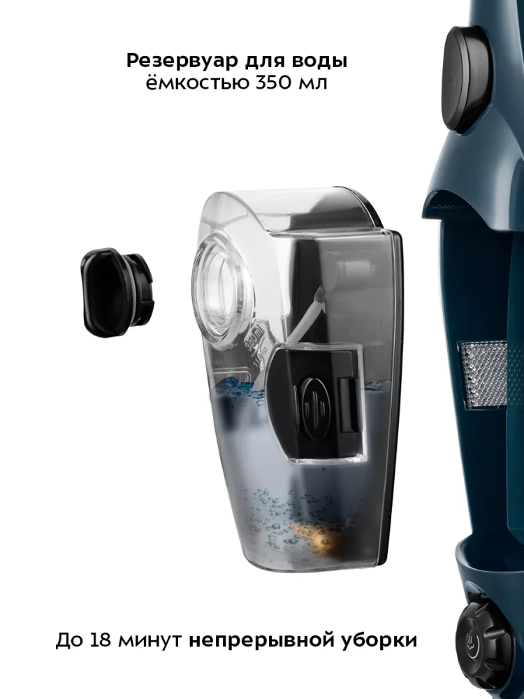 Устройство оснащено съемным резервуаром для воды емкостью 350 мл, что позволяет производить непрерывную уборку до 8–18 минут в зависимости от интенсивности выходящего пара.