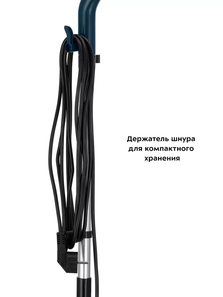 Паровая швабра обладает функцией вертикальной парковки и большим углом наклона при уборке, который поможет убрать пространство под мебелью. В устройстве предусмотрены держатели и зажим для шнура. Удлинительная трубка съемная, что обеспечивает компактное хранение.