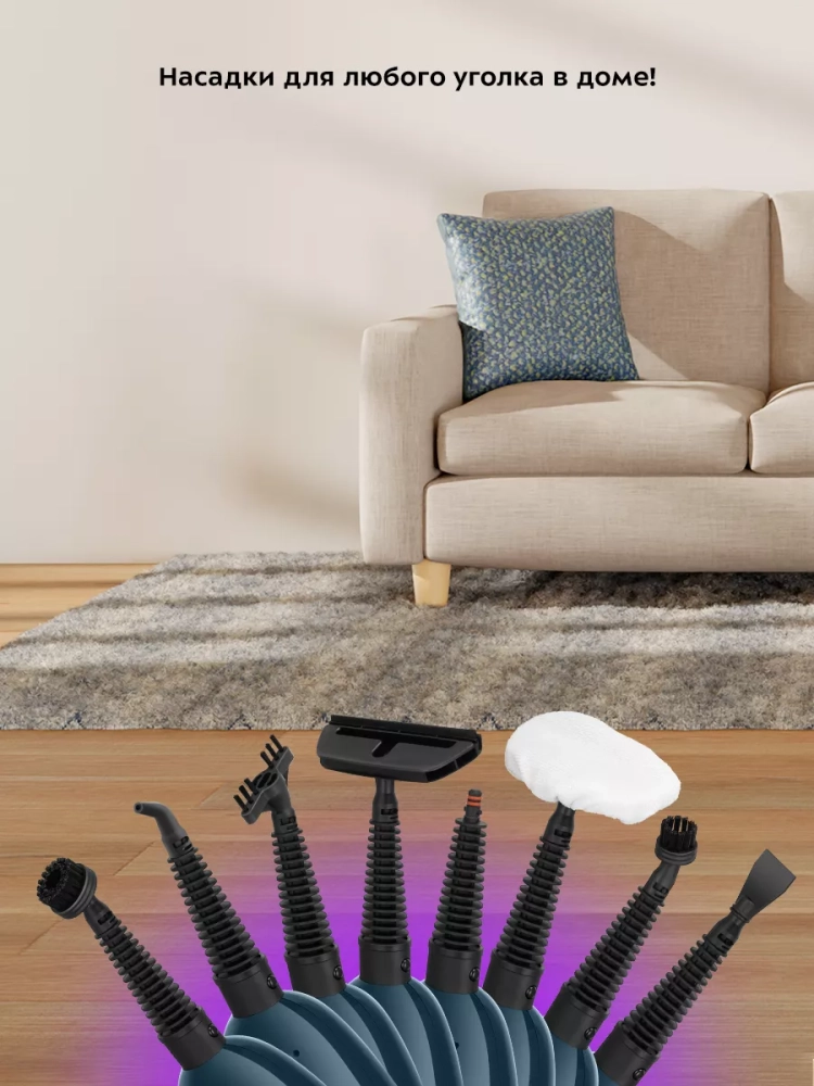 Конструкция «2 в 1» предусматривает использование ручного модуля паровой швабры с насадками без присоединения к нему удлинительной трубки с рукояткой. Большое количество насадок в комплекте поможет очистить труднодоступные или сильнозагрязненные поверхности. Скребок и нейлоновые щетки эффективно очищают сложные загрязнения с помощью механического воздействия. Для очистки окон, зеркал и кафельной плитки используется насадка для отпаривания со скребком. Если на данную насадку надеть тряпку для отпаривания, насадка может использоваться для отпаривания одежды и чистки обивки мягкой мебели. Струйная и угловая насадки помогут очистить щели и углы. С помощью мерного стакана из комплекта удобно заполнять резервуар для воды.