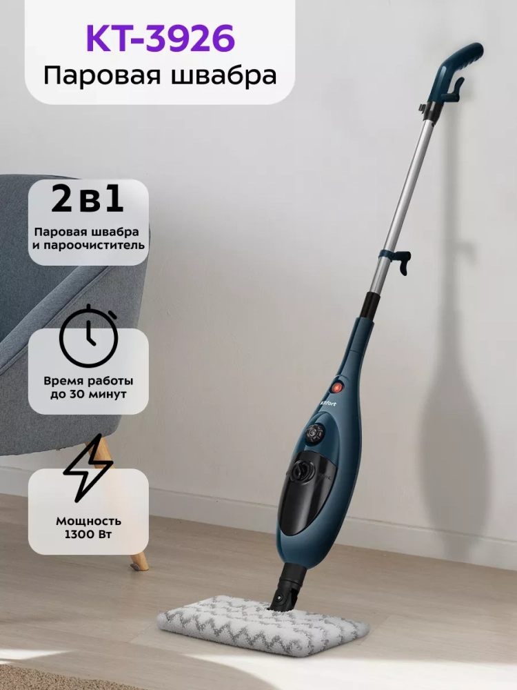 Паровая швабра КТ-3926 проста в использовании. Уборка с ней будет проходить быстро и легко.