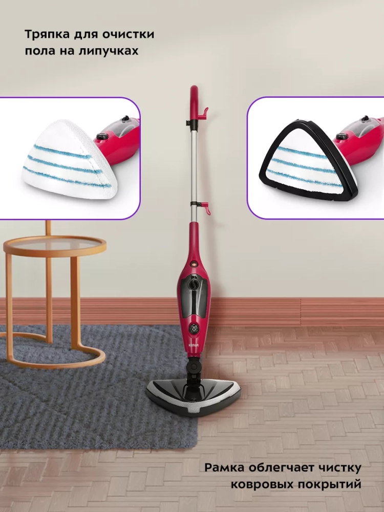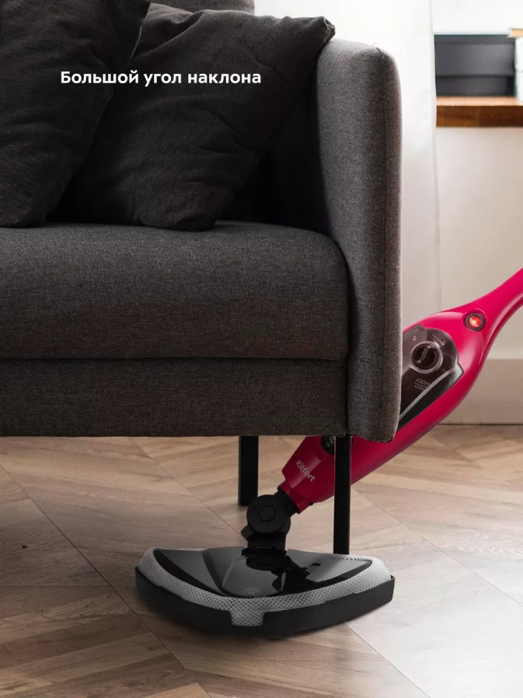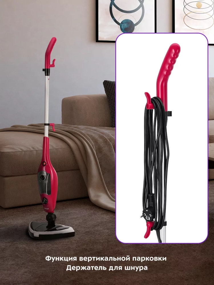 Паровая швабра обладает функцией вертикальной парковки и большим углом наклона при уборке, который поможет убрать пространство под мебелью. В устройстве предусмотрены держатели и зажим для шнура. Удлинительная трубка съемная, что обеспечивает компактное хранение.