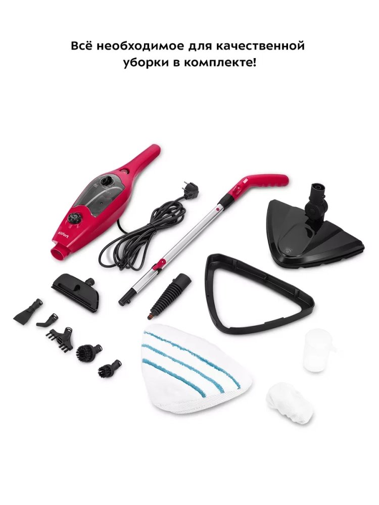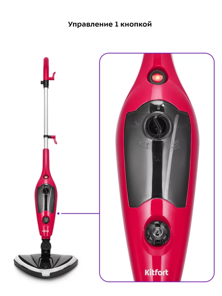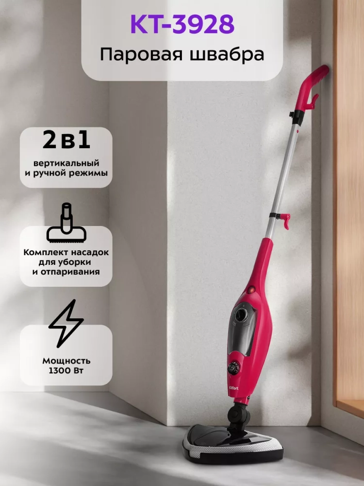 Паровая швабра Kitfort КТ-3928 — универсальное устройство, которое поможет избавиться от пыли и грязи с помощью мощной струи пара, а также продезинфицирует обрабатываемую поверхность. При помощи специальных насадок из комплекта КТ-3928 очистит напольные покрытия, раковину и плиту на кухне, зеркала, окна и плитку в ванной без каких-либо химических средств — исключительно паром.