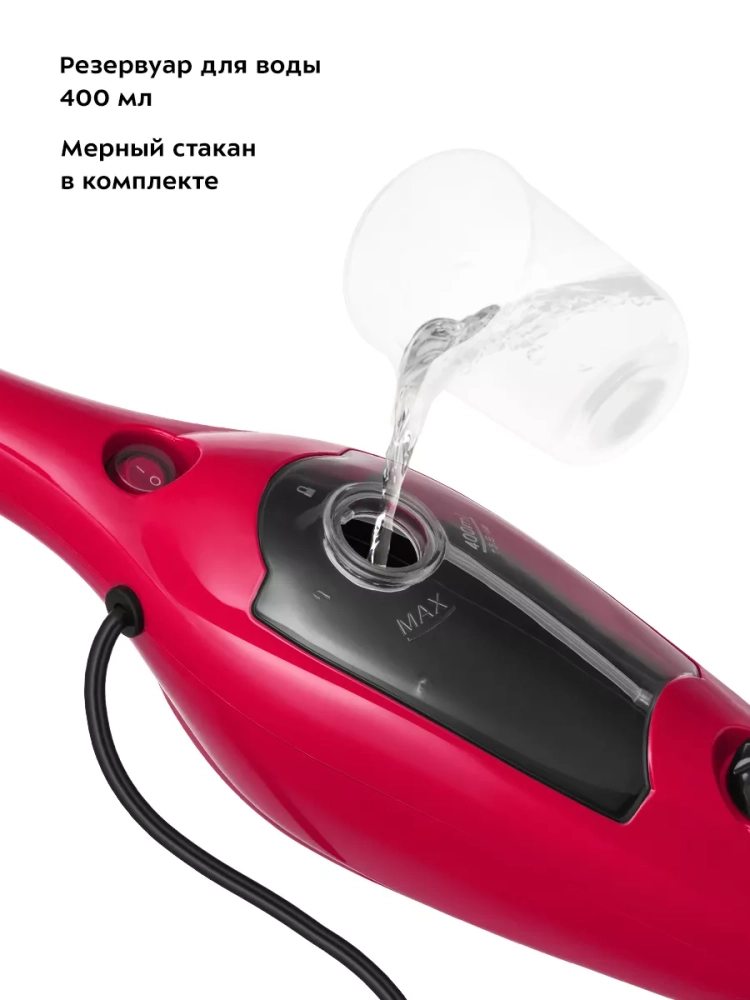 Устройство оснащено съемным резервуаром для воды емкостью 400 мл, что позволяет производить непрерывную уборку до 15–30 минут в зависимости от интенсивности выходящего пара.