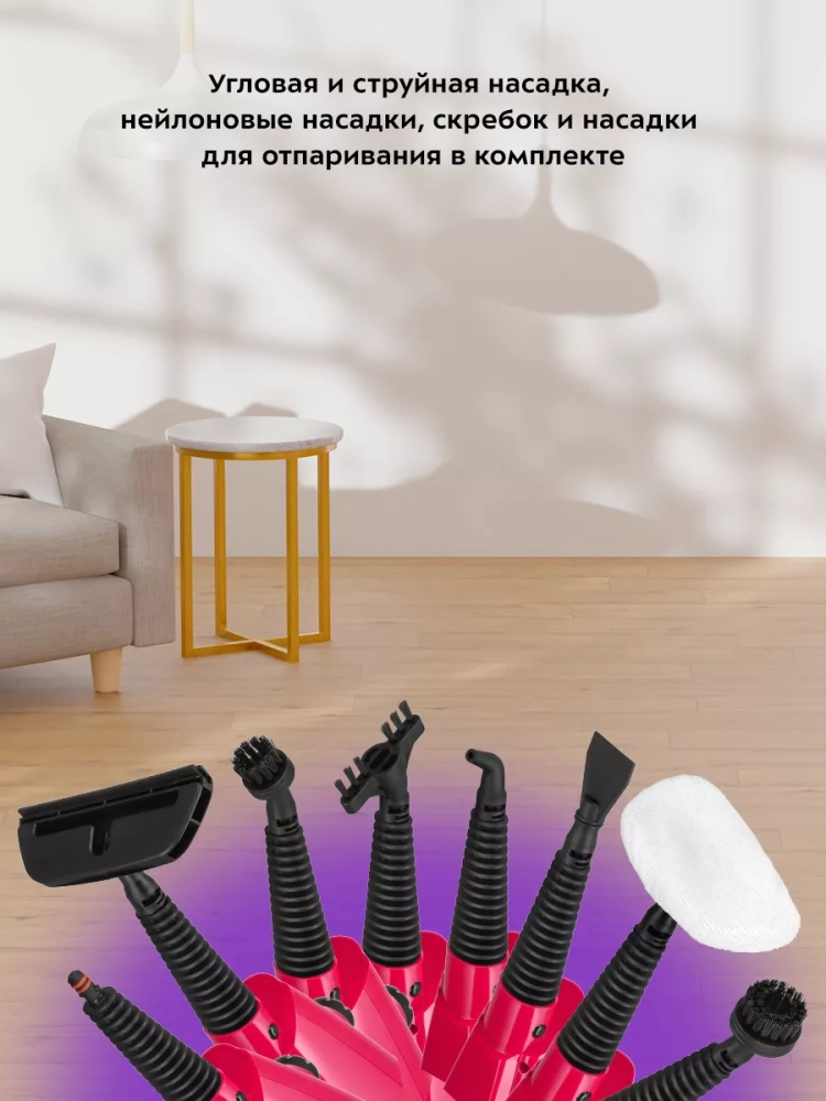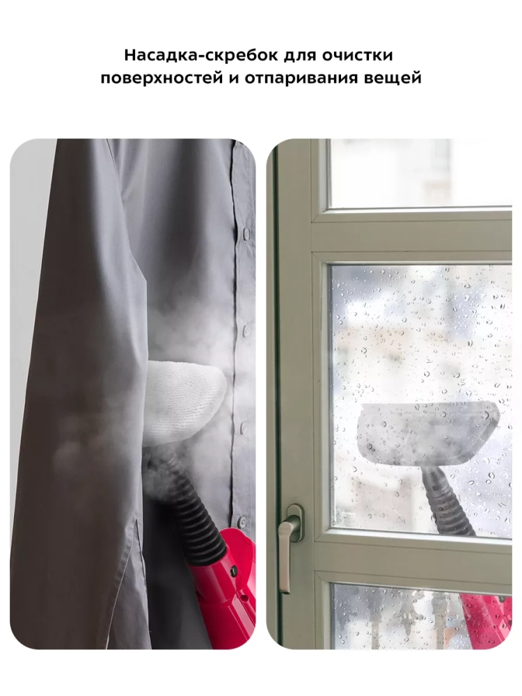 Конструкция «2 в 1» предусматривает использование ручного модуля паровой швабры с насадками без присоединения к нему удлинительной трубки с рукояткой. Большое количество насадок в комплекте поможет очистить труднодоступные или сильнозагрязненные поверхности. Скребок и нейлоновые щетки эффективно очищают сложные загрязнения с помощью механического воздействия. Для очистки окон, зеркал и кафельной плитки используется насадка для отпаривания со скребком. Если на данную насадку надеть тряпку для отпаривания, насадка может использоваться для отпаривания одежды и чистки обивки мягкой мебели. Струйная и угловая насадки помогут очистить щели и углы. С помощью мерного стакана из комплекта удобно заполнять резервуар для воды.