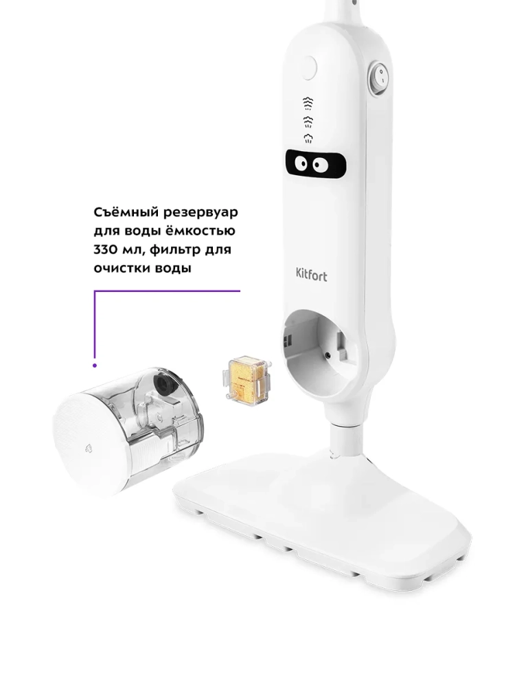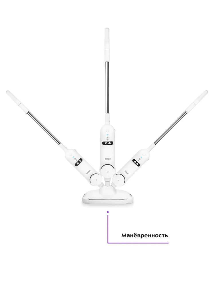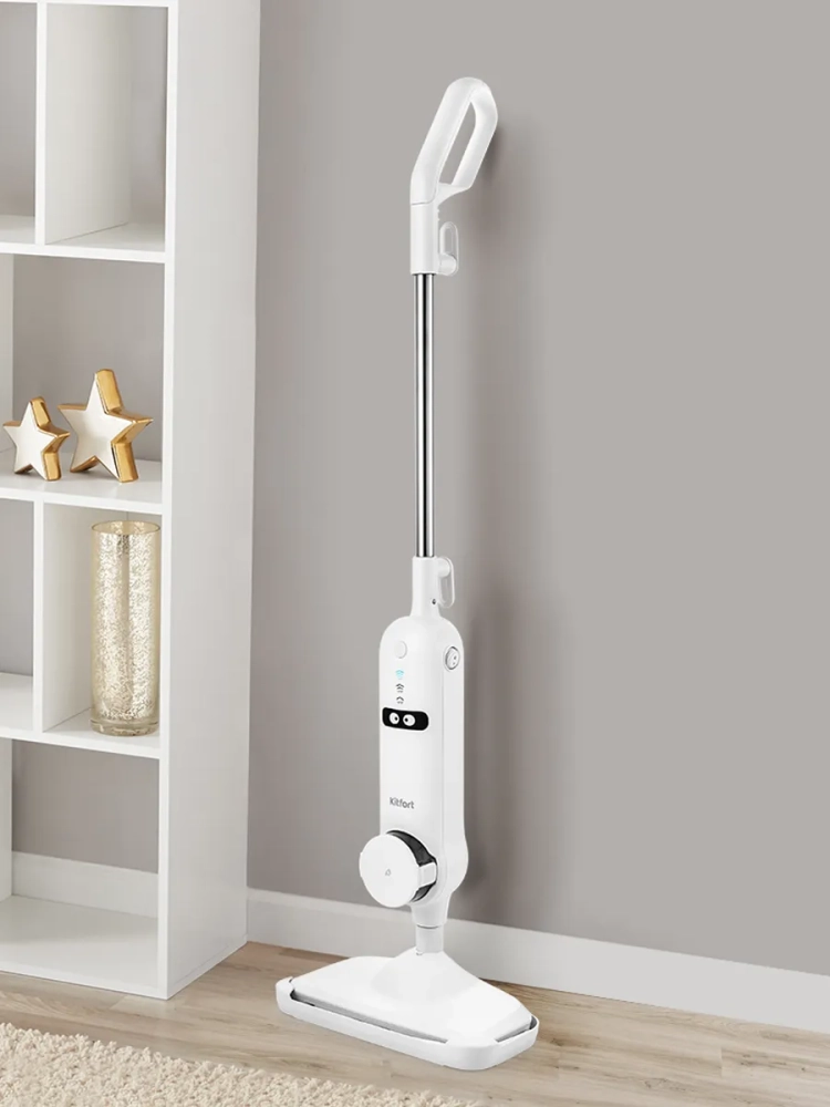 Паровая швабра Kitfort КТ-1015 - универсальное устройство, которое поможет избавиться от пыли и грязи с помощью мощной струи пара, а также продезинфицирует обрабатываемую поверхность. Принцип действия паровой швабры основан на воздействии горячего пара на загрязнения. Пар проникает внутрь загрязнения, размягчая и растворяя его, а затем с помощью тряпки частички грязи смываются. Высокая температура пара способствует процессу очистки. Нерастворимое в воде загрязнение (например, жировое отложение) удаляется аналогичным образом: под действием высокой температуры пара оно размягчается, а пар вместе с механическим воздействием на загрязнение превращает его в эмульсию, состоящую из мелких частичек загрязнения и воды. Эта эмульсия затем может быть легко удалена тряпкой. Во время работы паровой швабры вода из резервуара подается в бойлер помпой (водяным насосом). Для паровой швабры не нужны чистящие средства, поэтому она станет идеальным решением уборки дома для аллергиков. Помимо полов вы можете обработать и очистить паром остальные поверхности и предметы. Для этого у паровой швабры КТ-1015 отсоединяется удлинительная трубка и щетка для пола, превращаясь в удобный компактный ручной модуль. Кнопка переключения уровня выбрасываемого пара позволяет настраивать интенсивность работы устройства. Это очень удобно при очистке разных типов поверхностей с разным уровнем загрязнения. Паровая швабра обладает функцией вертикальной парковки и большим углом наклона при уборке, который поможет легко убирать пространство под мебелью. Напольная щетка закреплена на специальном шаровом шарнире с наклоном в двух плоскостях, что делает швабру очень маневренной и облегчает уборку. Паровая швабра КТ-1015 очень легкая и простая в использовании. Уборка с ней будет проходить быстро и легко.