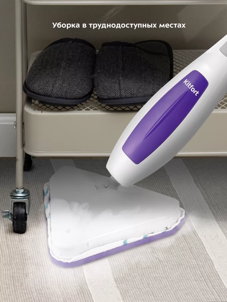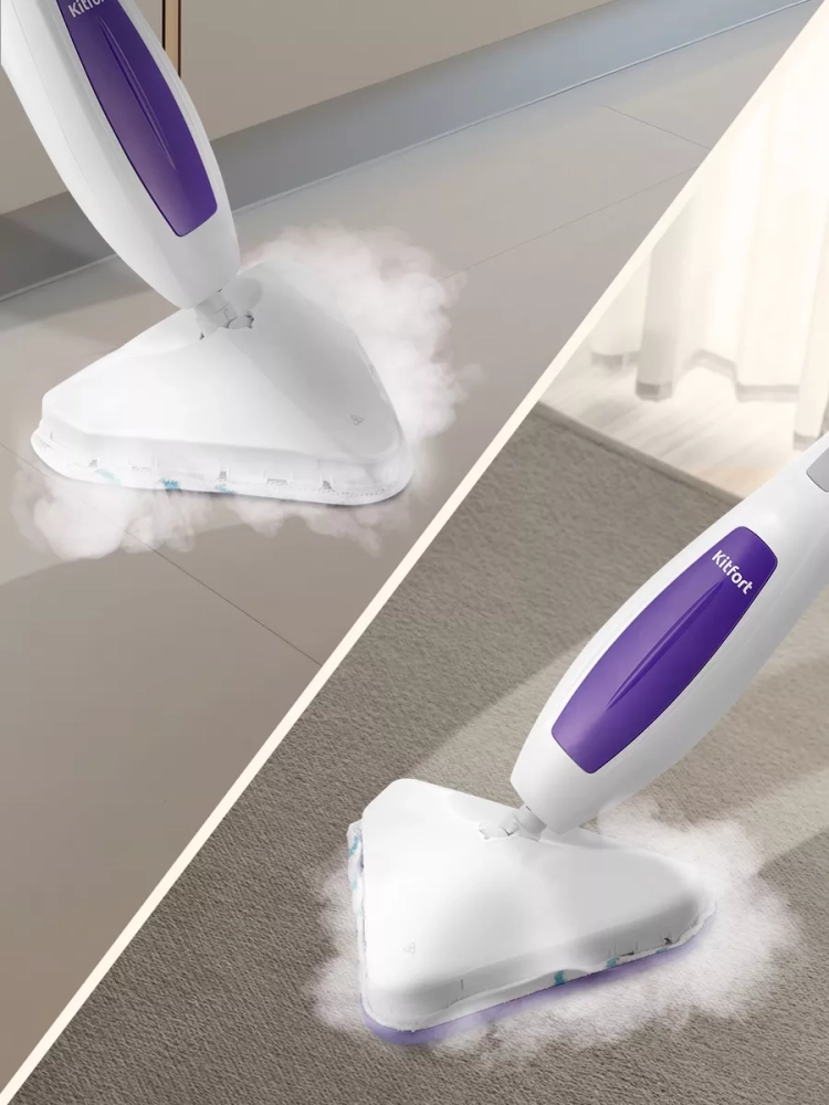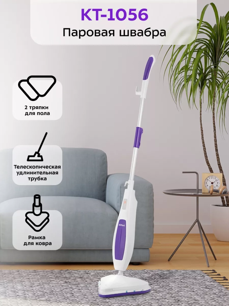 Паровая швабра Kitfort КТ-1056 — универсальное устройство, которое поможет избавиться от пыли и грязи с помощью мощной струи пара, а также продезинфицирует обрабатываемую поверхность.
