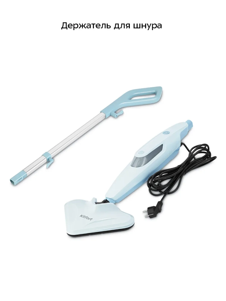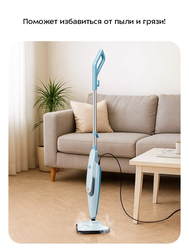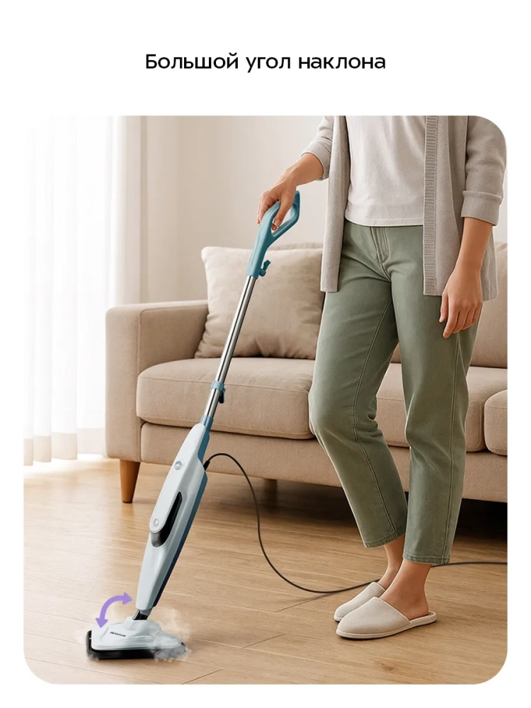 Паровая швабра обладает функцией вертикальной парковки и большим углом наклона при уборке, который поможет легко убирать пространство под мебелью. Напольная щетка закреплена на специальном шарнире с наклоном в двух плоскостях, что делает швабру очень маневренной и облегчает процесс уборки. На ручке устройства предусмотрены держатели для шнура.