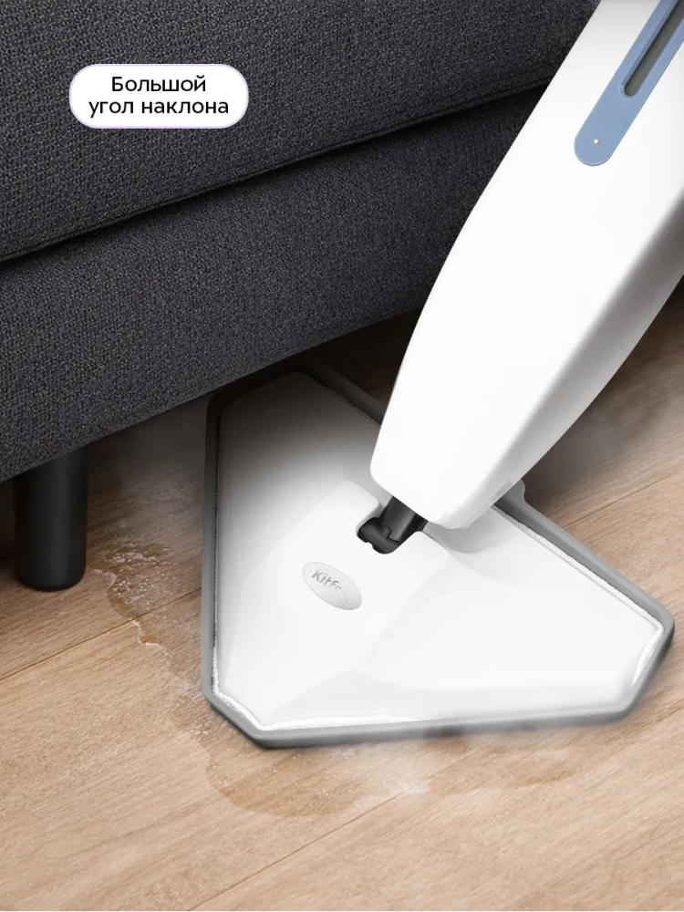 Паровая швабра обладает функцией вертикальной парковки и большим углом наклона, который поможет убрать пространство под мебелью. В комплекте есть рамка для ковра, обеспечивающая легкое скольжение напольной насадки по ковру. В устройстве предусмотрены держатели для шнура питания.