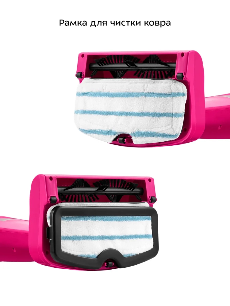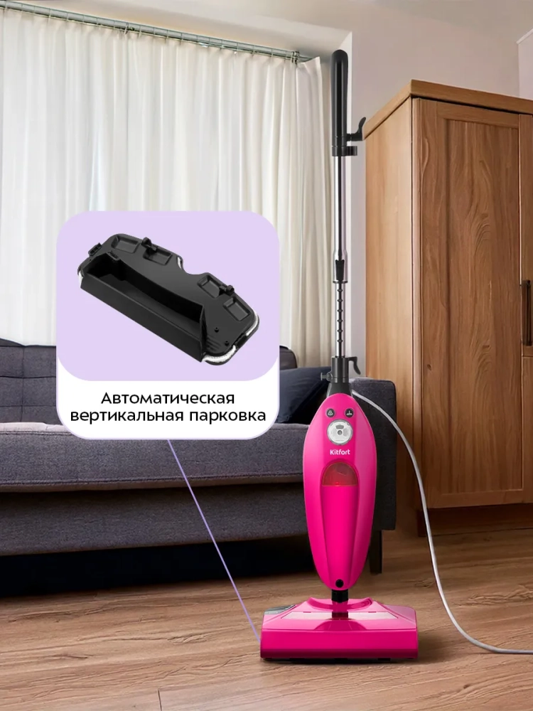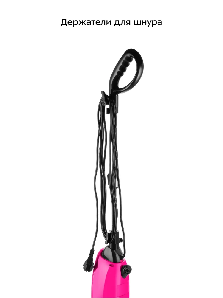 Паровая швабра обладает функцией вертикальной парковки и большим углом наклона, который поможет убрать пространство под мебелью. В комплекте есть рамка для ковра, обеспечивающая легкое скольжение напольной щетки по ковру. Телескопическая удлинительная трубка позволяет регулировать ее длину, как вам удобно. В устройстве предусмотрены держатели шнура. Удлинительную трубку можно снять для компактного хранения.