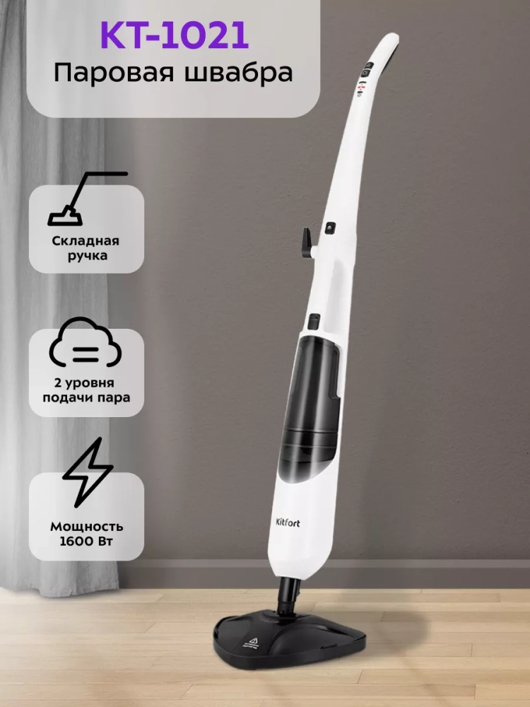Паровая швабра Kitfort КТ-1021 — универсальное устройство, которое поможет избавиться от пыли и грязи с помощью мощной струи пара, а также продезинфицирует обрабатываемую поверхность. Устройство оснащено съемным резервуаром для воды емкостью 500 мл, что позволяет производить непрерывную уборку до 25 минут. Также паровая швабра оснащена фильтром для смягчения воды, благодаря которому уменьшается образование накипи и отложения солей в бойлере.