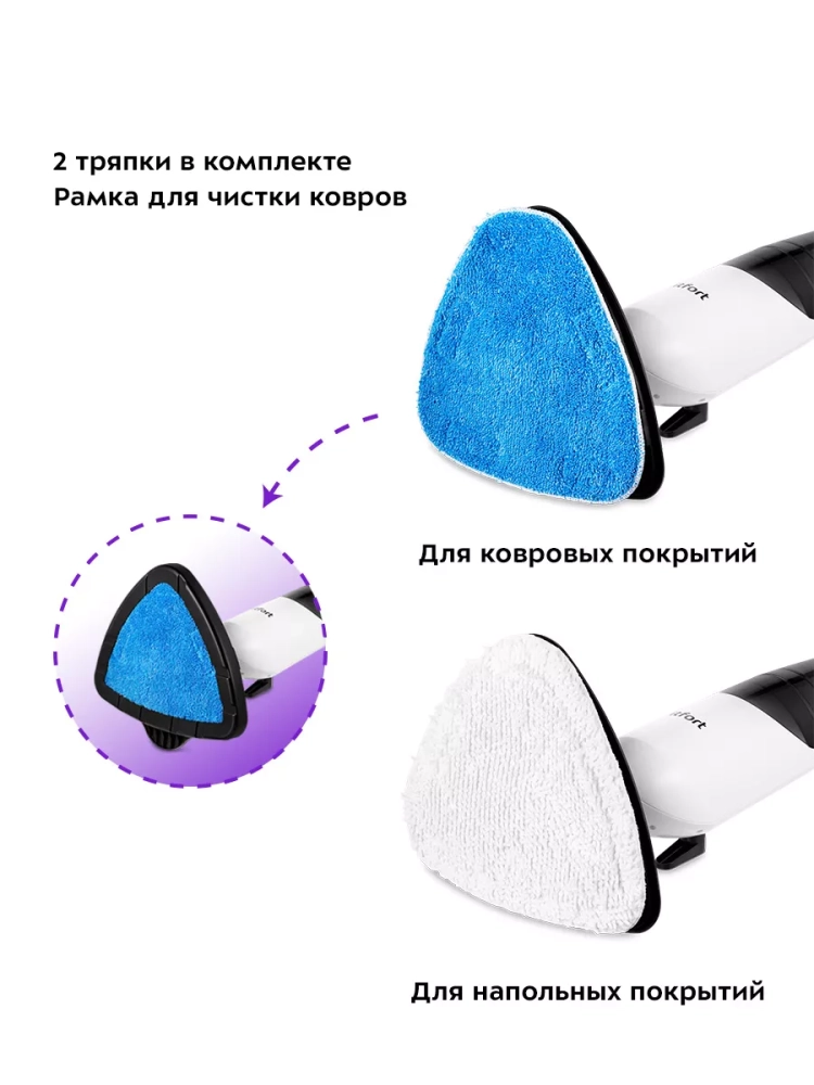 Два уровня подачи пара позволяют настраивать интенсивность работы устройства. Это очень удобно при очистке разных типов поверхностей с разным уровнем загрязнения. Рамка для ковра облегчает скольжение напольной щетки по ковру и предотвращает смещение тряпки по краям.