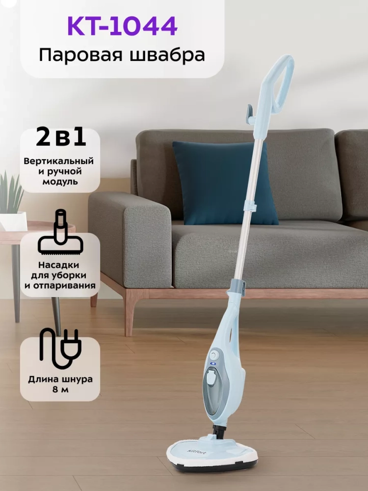 Паровая швабра Kitfort КТ-1044 - универсальное устройство, которое поможет избавиться от пыли и грязи с помощью мощной струи пара, а также продезинфицирует обрабатываемую поверхность. Паровая швабра представляет собой парогенератор с удлинительной ручкой и щеткой для пола, а также насадками для разных случаев уборки. Благодаря шнуру на 8 метров вам не придется каждый раз выключать устройство, чтобы подключить его к другой розетке при уборке.