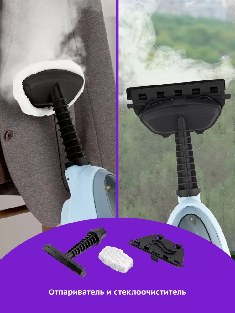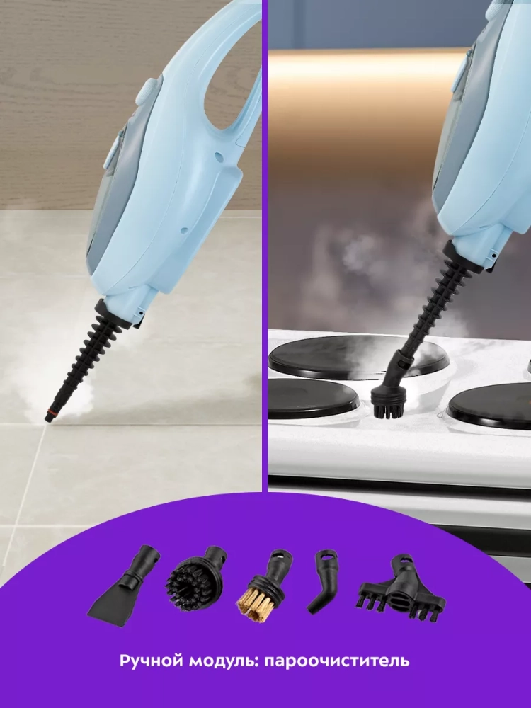 Если отсоединить удлинительную ручку и щетку для пола, то швабра превращается в ручной пароочиститель или отпариватель. Им можно чистить паром различные поверхности и предметы: кафель и швы между плитками, сантехнику для кухни и ванны, духовки, плиты, СВЧ печи, жировые и известковые отложения. Для усиления механического воздействия в комплекте идут ворсовые щетки и скребок.