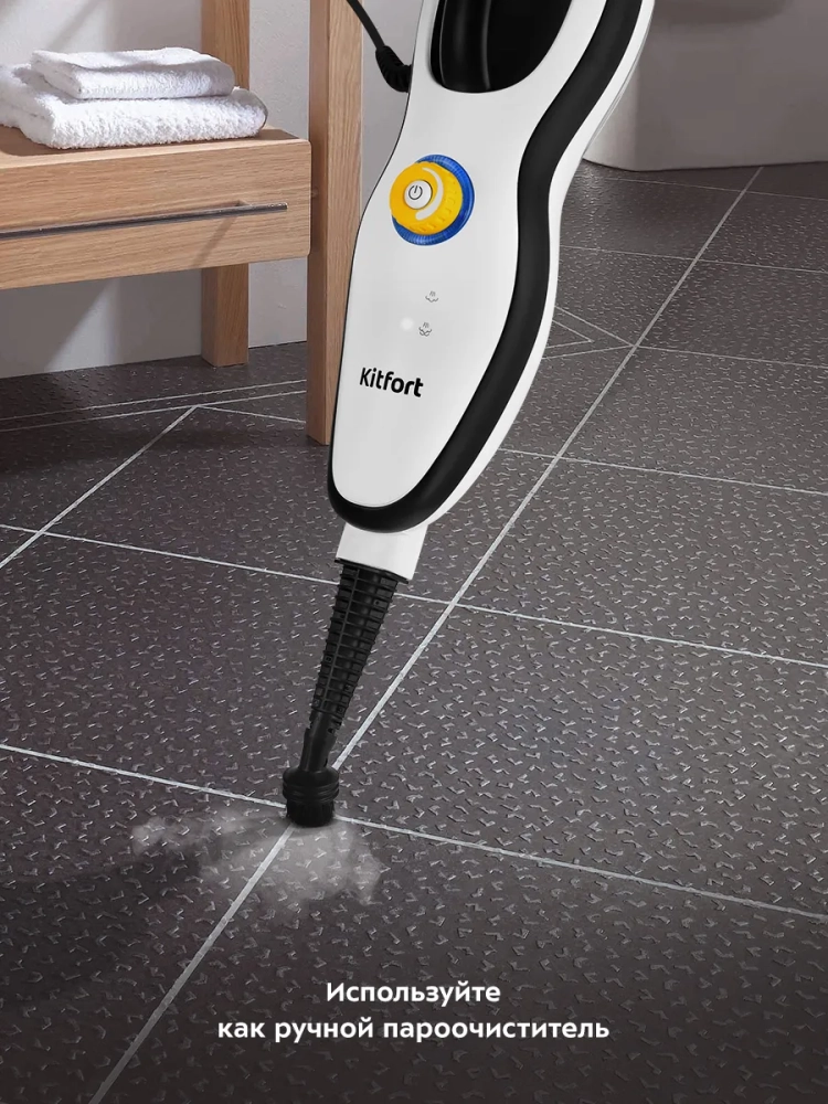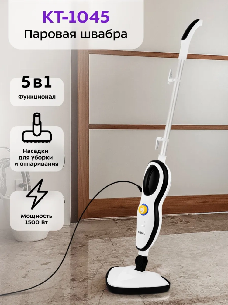 Паровая швабра Kitfort КТ-1045 – универсальное устройство, которое поможет избавиться от пыли и грязи с помощью мощной струи пара, а также продезинфицирует обрабатываемую поверхность. Паровая швабра представляет из себя парогенератор с удлиненной ручкой и щеткой для пола.