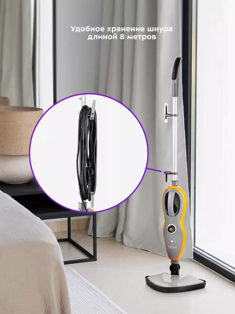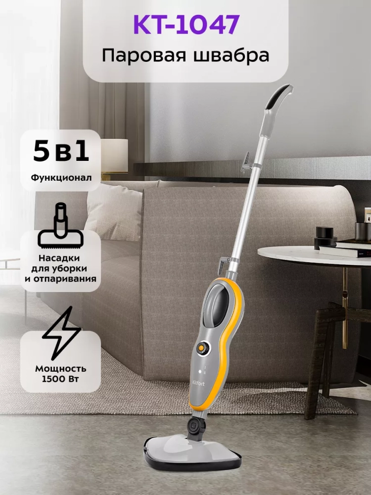 Паровая швабра Kitfort КТ-1047 – универсальное устройство, которое поможет избавиться от пыли и грязи с помощью мощной струи пара, а также продезинфицирует обрабатываемую поверхность. Паровая швабра представляет из себя парогенератор с удлиненной ручкой и щеткой для пола.