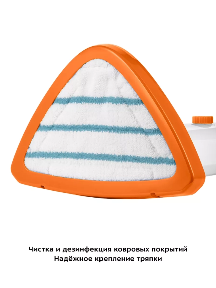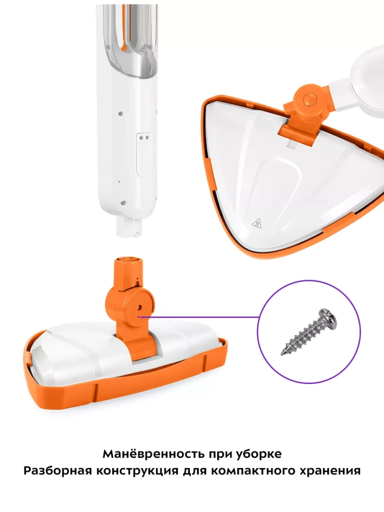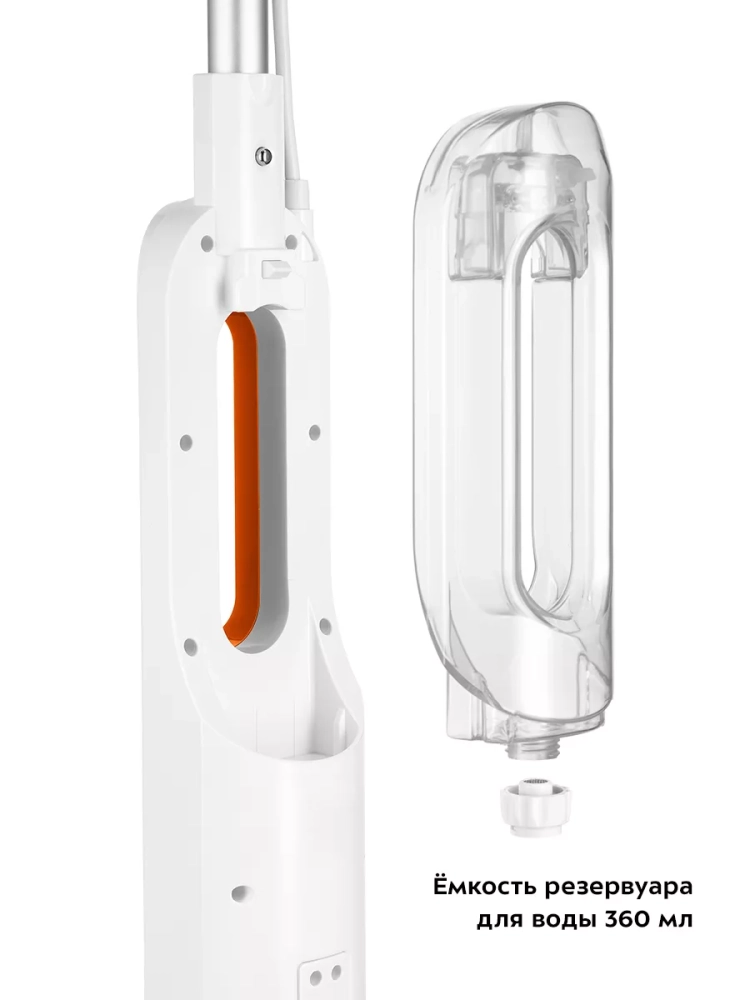 Паровая швабра обладает функцией вертикальной парковки и большим углом наклона при уборке, который поможет легко убирать пространство под мебелью. Напольная щетка закреплена на специальном шаровом шарнире с наклоном в двух плоскостях, что делает швабру очень маневренной и облегчает уборку. Также у паровой швабры предусмотрены держатели для шнура.