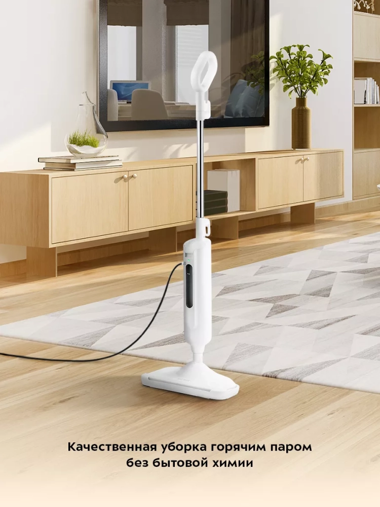 Паровая швабра обладает функцией вертикальной парковки и большим углом наклона при уборке, который поможет легко убирать пространство под мебелью. Напольная щетка закреплена на специальном шаровом шарнире с наклоном в двух плоскостях, что делает швабру очень маневренной и облегчает уборку. На удлинительной трубке с ручкой предусмотрены держатели для шнура.