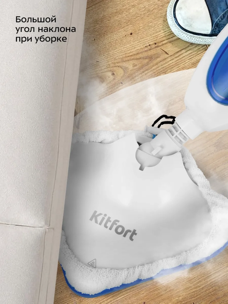 Паровая швабра обладает функцией вертикальной парковки и большим углом наклона при уборке, который поможет легко убирать пространство под мебелью. Напольная щетка закреплена на специальном шаровом шарнире с наклоном в двух плоскостях, что делает швабру очень маневренной и облегчает процесс уборки. На удлинительной трубке предусмотрены держатели для шнура.
