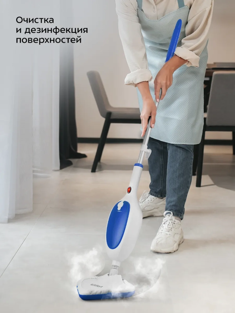 Паровая швабра Kitfort КТ-1054 — универсальное устройство, которое поможет избавиться от пыли и грязи с помощью мощной струи пара, а также продезинфицирует обрабатываемую поверхность. Паровая швабра очистит раковину и плиту на кухне, зеркала и мебель без каких-либо химических средств, исключительно паром.