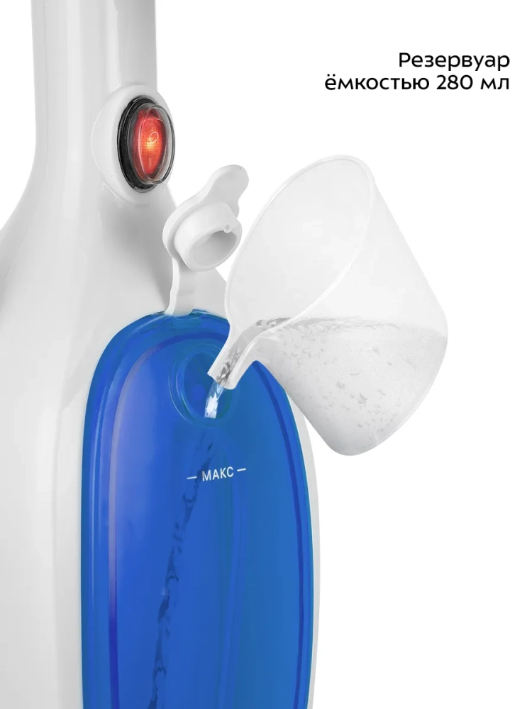 Устройство оснащено несъемным резервуаром для воды емкостью 280 мл, что позволяет производить непрерывную уборку в течение 13 минут.