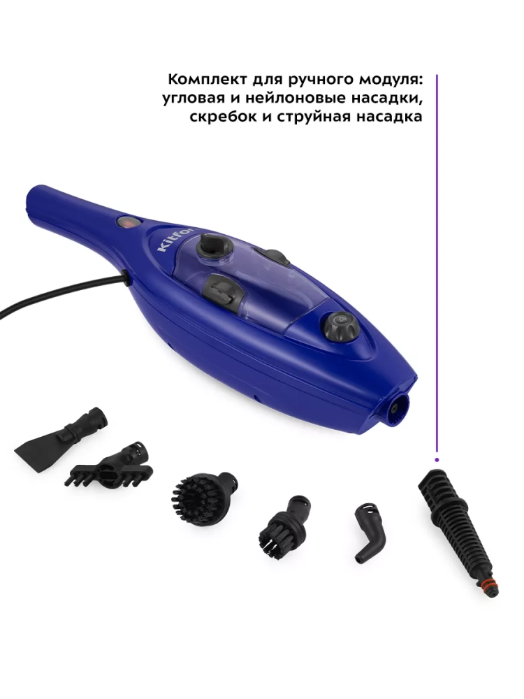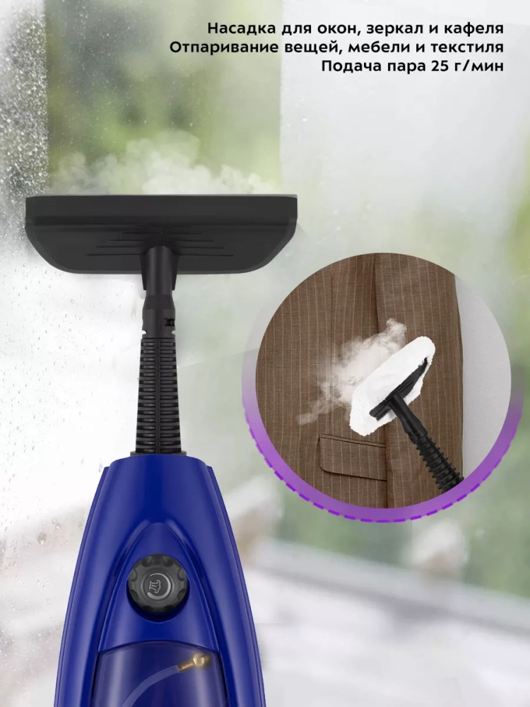 Конструкция «2 в 1» предусматривает наличие ручного модуля, который удобно использовать с насадками. С помощью насадок можно очистить большинство вещей в доме: легко отмыть окна, почистить шторы и мягкую мебель. Плоская и круглые нейлоновые щетки эффективно очищают сложные загрязнения с помощью механического воздействия. Для очистки окон, зеркал и кафельной плитки предусмотрена специальная насадка для отпаривания с резиновым скребком. Ее можно использовать с тряпкой для отпаривания, чтобы отпаривать одежду и чистить обивку мягкой мебели.