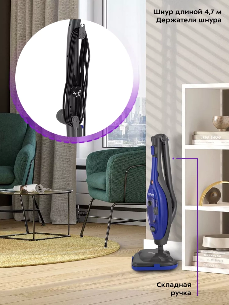 Паровая швабра обладает функцией вертикальной парковки и большим углом наклона при уборке, который поможет легко убирать пространство под мебелью. Напольная щетка закреплена на специальном шаровом шарнире с наклоном в двух плоскостях, что делает швабру очень маневренной и облегчает процесс уборки. На корпусе предусмотрены держатели для шнура. Ручка корпуса складная, благодаря чему швабра занимает меньше места при хранении.