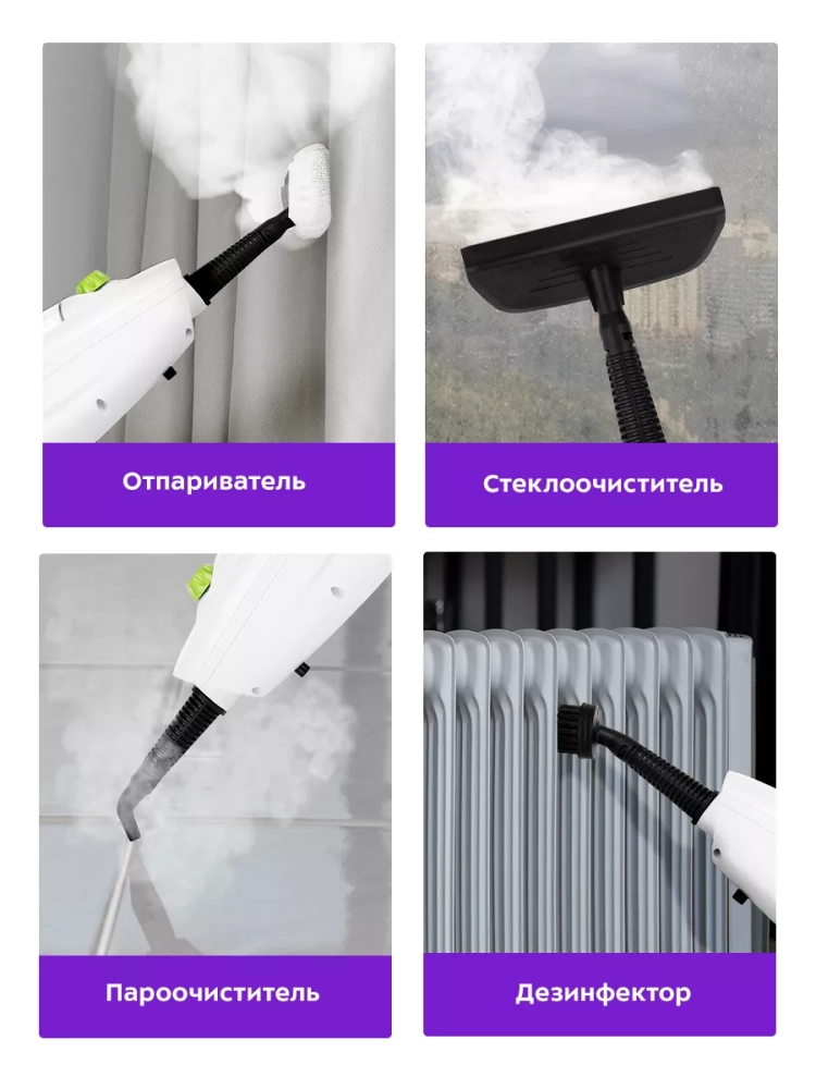 Конструкция «2 в 1» предусматривает наличие ручного модуля, который удобно использовать с насадками. С помощью насадок можно очистить большинство вещей в доме: легко отмыть окна, почистить шторы и мягкую мебель. Плоская и круглые нейлоновые щетки эффективно очищают сложные загрязнения с помощью механического воздействия. Для очистки окон, зеркал и кафельной плитки предусмотрена специальная насадка для отпаривания с резиновым скребком. Ее можно использовать с тряпкой для отпаривания, чтобы отпаривать одежду и чистить обивку мягкой мебели.