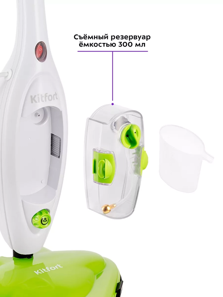 Устройство оснащено съемным резервуаром для воды емкостью 300 мл, что позволяет производить непрерывную уборку до 20 минут в зависимости от интенсивности подачи пара.
