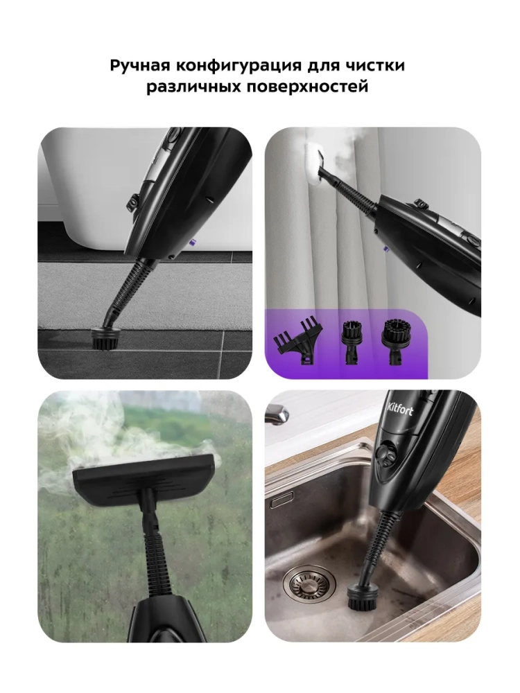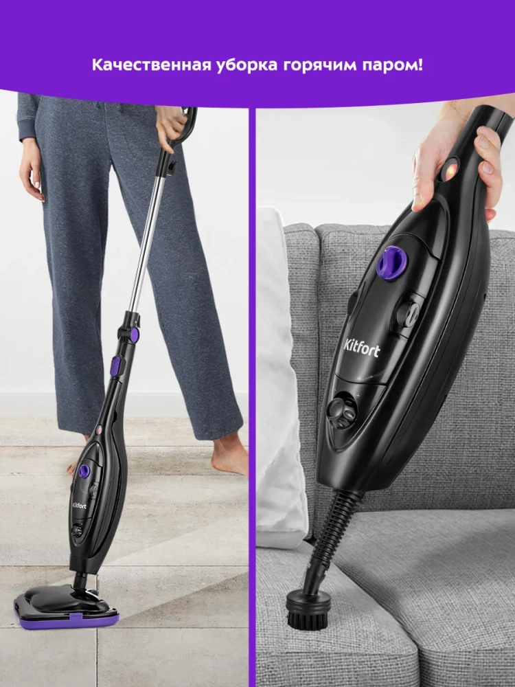 Паровая швабра Kitfort КТ-1061 — универсальное устройство, которое поможет избавиться от пыли и грязи с помощью мощной струи пара, а также продезинфицирует обрабатываемую поверхность. Паровая швабра очистит раковину и плиту на кухне, зеркала и мебель без каких-либо химических средств, исключительно паром.