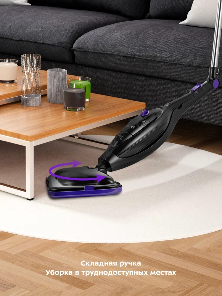 Паровая швабра обладает функцией вертикальной парковки и большим углом наклона при уборке, а также удлинительную ручку можно сложить, чтобы легко убирать пространство под мебелью. Напольная щетка закреплена на специальном шаровом шарнире с наклоном в двух плоскостях, что делает швабру очень маневренной и облегчает процесс уборки. На корпусе предусмотрены держатели для шнура.