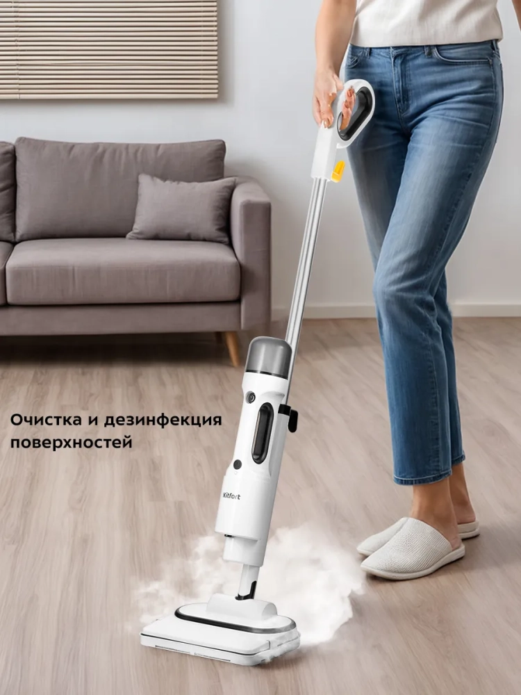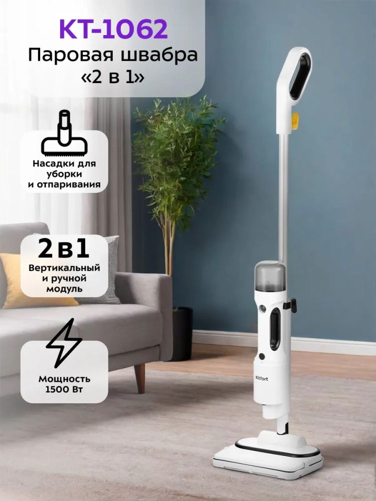 Паровая швабра Kitfort КТ-1062 — универсальное устройство, которое поможет избавиться от пыли и грязи с помощью мощной струи пара, а также продезинфицирует обрабатываемую поверхность. Паровая швабра очистит раковину и плиту на кухне, зеркала и мебель без каких-либо химических средств, исключительно паром.