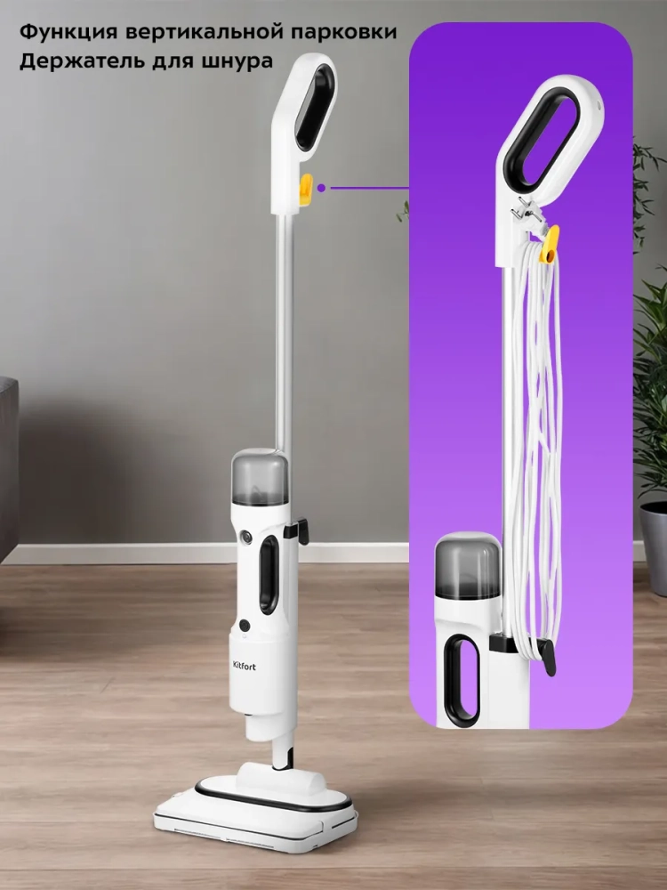 Паровая швабра обладает функцией вертикальной парковки и большим углом наклона при уборке. На корпусе предусмотрены держатели шнура.