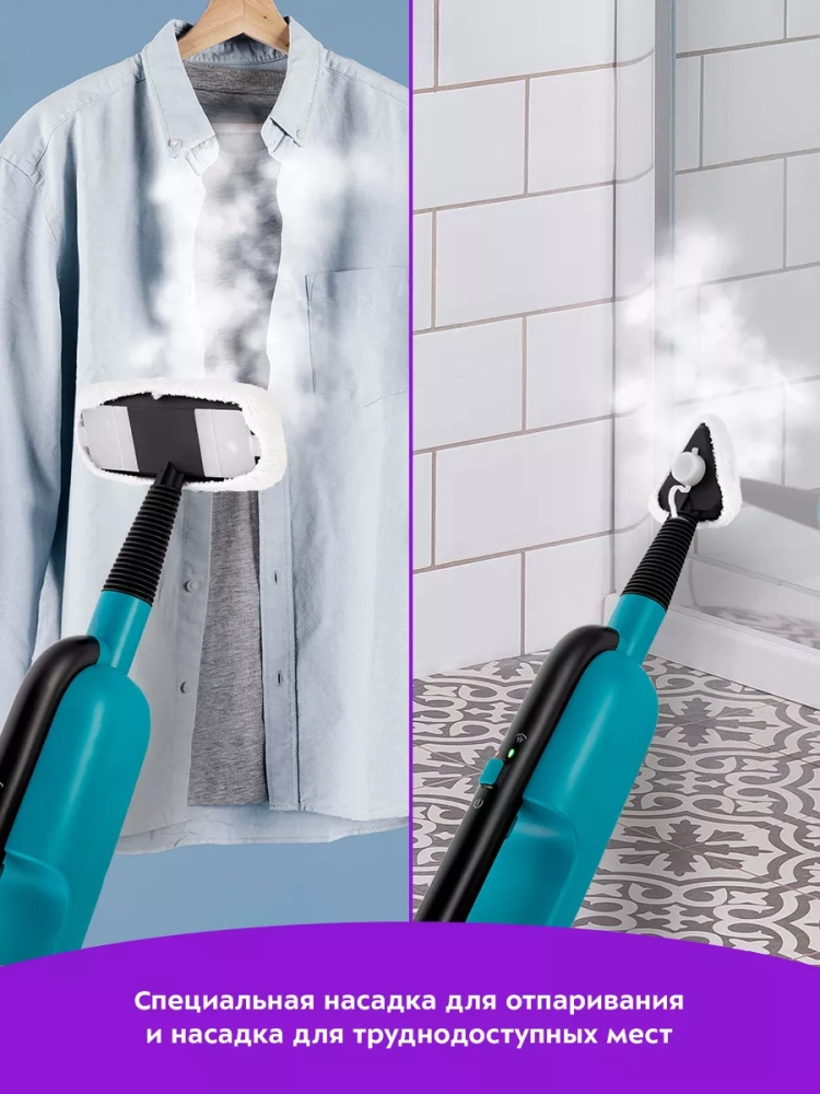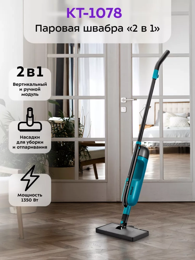 Паровая швабра Kitfort КТ-1078 (2 в 1) — универсальное устройство, которое поможет избавиться от пыли и грязи с помощью мощной струи пара, а также продезинфицирует обрабатываемую поверхность. КТ-1078 очистит напольные покрытия, раковину и плиту на кухне без каких-либо химических средств, исключительно паром.