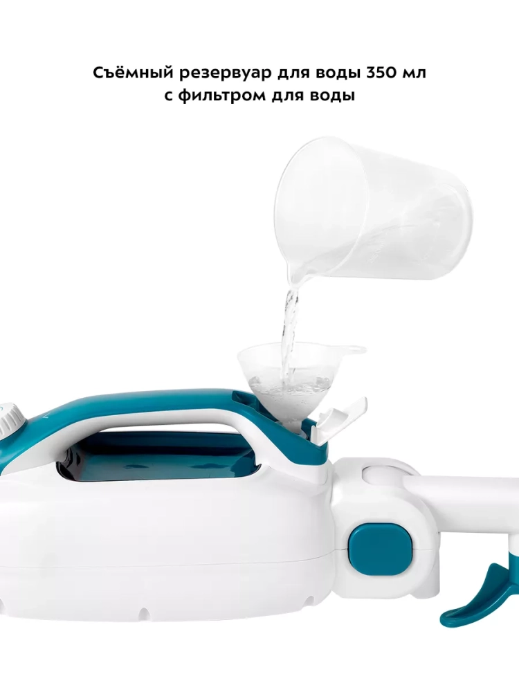 Устройство оснащено съемным резервуаром для воды емкостью 350 мл, что позволяет производить непрерывную уборку от 10 до 14 минут в зависимости от интенсивности подачи пара.