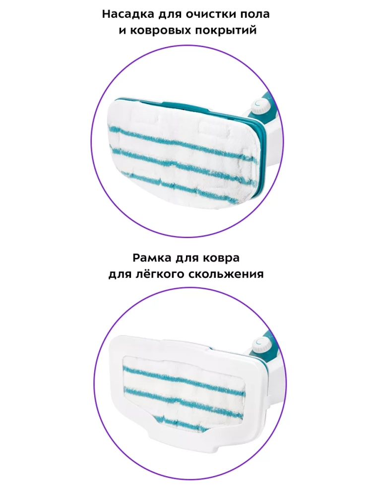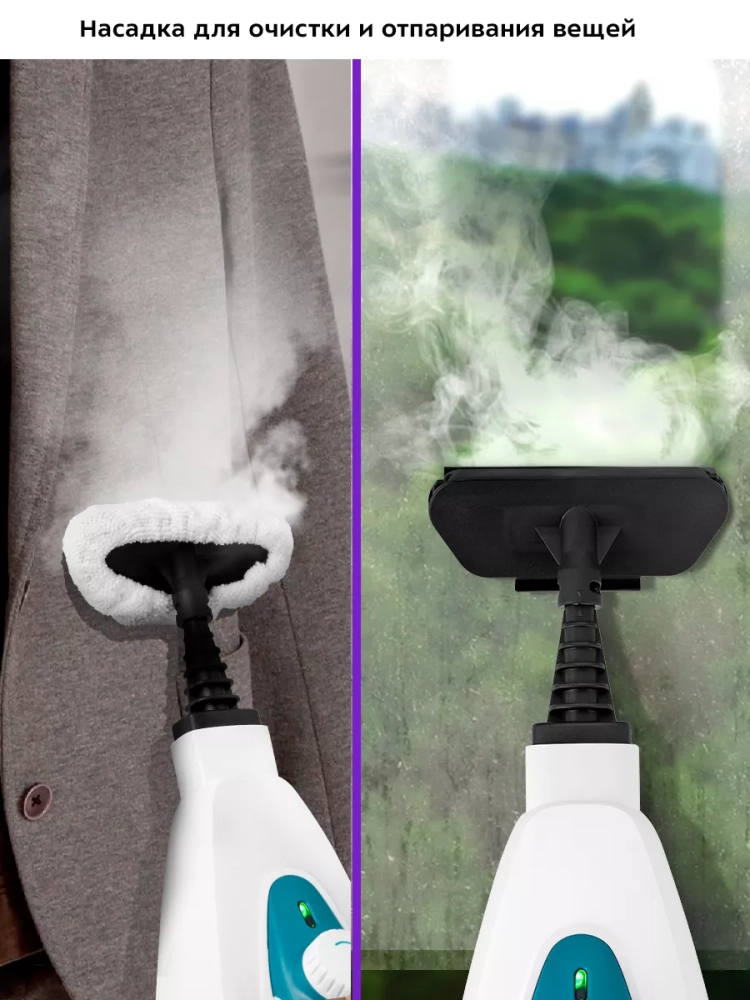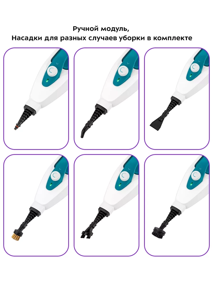 Конструкция «2 в 1» предусматривает наличие ручного модуля, который удобно использовать с насадками. С помощью насадок можно очистить большинство вещей в доме: легко отмыть окна, почистить шторы и мягкую мебель. Скребок, латунная и нейлоновые щетки эффективно очищают сложные загрязнения с помощью механического воздействия. В комплекте есть насадка для отпаривания с тряпкой для отпаривания, чтобы отпаривать одежду и чистить обивку мягкой мебели. На насадке для отпаривания предусмотрен резиновый скребок для очистки окон, зеркал и кафельной плитки. Струйная и угловая насадки помогут очистить щели и углы.