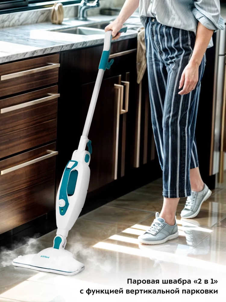 Паровая швабра Kitfort КТ-1080 — универсальное устройство, которое поможет избавиться от пыли и грязи с помощью мощной струи пара, а также продезинфицирует обрабатываемую поверхность. Паровая швабра очистит раковину и плиту на кухне, зеркала и мебель без каких-либо химических средств, исключительно паром.
