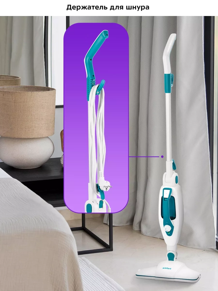 Паровая швабра обладает функцией вертикальной парковки и большим углом наклона при уборке. На корпусе предусмотрены держатели для шнура.
