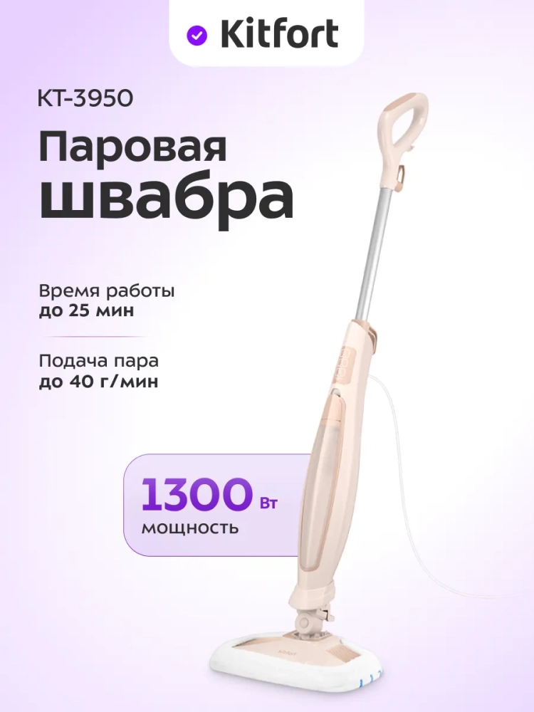 Паровая швабра Kitfort КТ-3950 — универсальное устройство, которое поможет избавиться от пыли и грязи с помощью мощной струи пара, а также продезинфицирует обрабатываемую поверхность. Устройство оснащено резервуаром для воды емкостью 500 мл, что позволяет производить непрерывную уборку 12–25 минут.