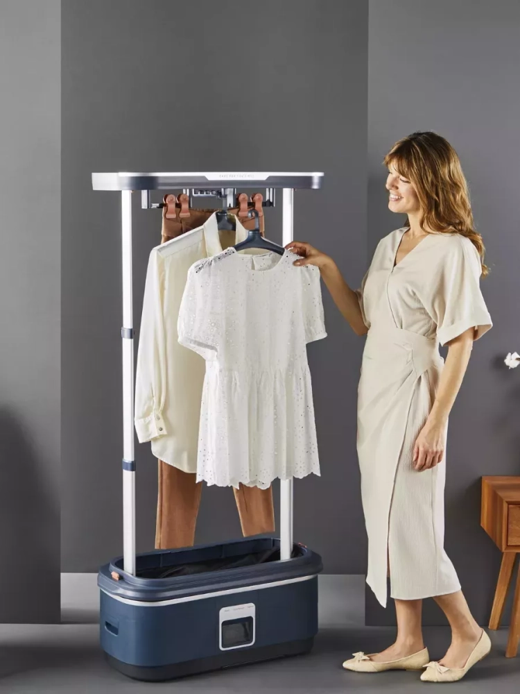 Благодаря вращающимся на 360° вешалкам и зажимам для брюк вы можете легко отпаривать до 3 предметов одежды одновременно, максимально экономя время. Автоматический отпариватель позволяет быстро и безопасно освежить и дезинфицировать одежду из тканей, которые обычно требуют особого ухода или химчистки: шелка, кашемира, шерсти и других. Прибор имеет дистанционное управление, 3 поворотные вешалки, съемный резервуар для воды объемом 1,2 л и мобильную складную конструкцию.