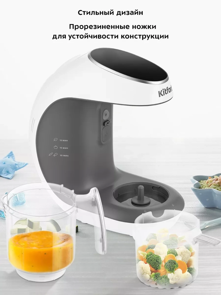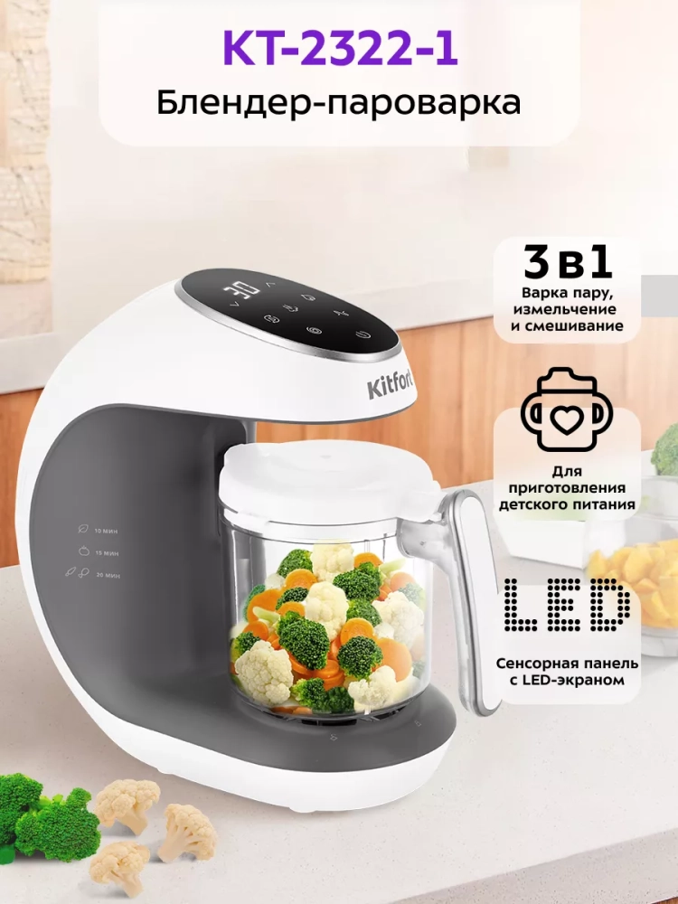 Вкусные и полезные блюда лучше всего готовить на пару — продукты готовятся равномерно и не пригорают, в них сохраняются полезные вещества и витамины. Для прикорма детей до года приготовленную пищу необходимо измельчить до нужной консистенции. Блендер-пароварка Kitfort КТ-2322 идеально подходит для приготовления детского питания: варит на пару, затем измельчает и смешивает. Прибор будет хорошим помощником родителям на кухне и поможет сэкономить время. Благодаря постоянной циркуляции пара в чаше, продукты в корзине равномерно прогреваются и готовятся. По окончании готовки прибор автоматически отключается, поэтому пища не переварится. После варки на пару продукты необходимо переложить из корзины в чашу и измельчить.