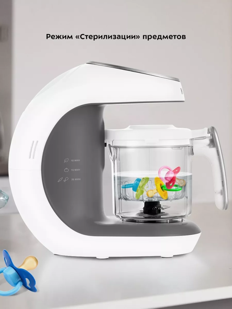 Управление прибором осуществляется с помощью сенсорной панели. Также у прибора есть дисплей, на котором отображается время варки продуктов. Время варки при желании можно увеличить или уменьшить. После варки на пару продукты можно автоматически измельчить. Есть и импульсный режим, в котором блендер работает, пока вы удерживаете кнопку. В приборе есть режим стерилизации, благодаря которому можно простерилизовать соски, крышки от бутылочек и прочие мелкие детские предметы. Когда вода в резервуаре закончится, прибор оповестит вас об этом звуковым сигналом и значком на панели.