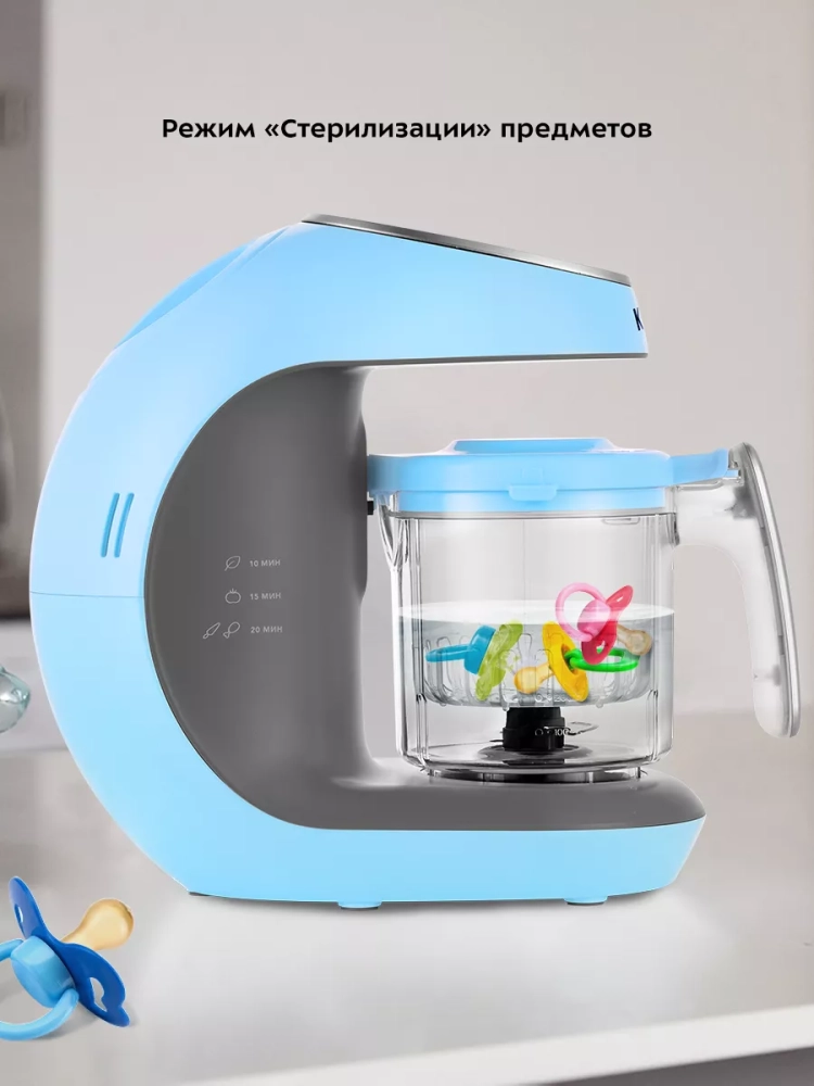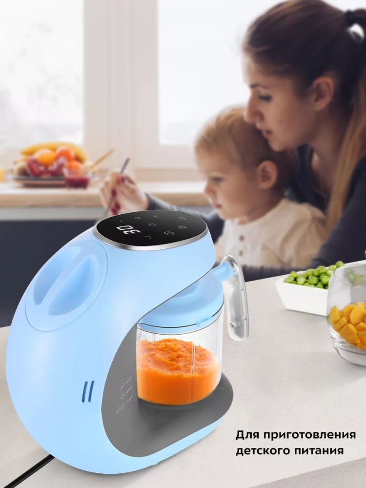 Управление прибором осуществляется с помощью сенсорной панели. Также у прибора есть дисплей, на котором отображается время варки продуктов. Время варки при желании можно увеличить или уменьшить. После варки на пару продукты можно автоматически измельчить. Есть и импульсный режим, в котором блендер работает, пока вы удерживаете кнопку. В приборе есть режим стерилизации, благодаря которому можно простерилизовать соски, крышки от бутылочек и прочие мелкие детские предметы. Когда вода в резервуаре закончится, прибор оповестит вас об этом звуковым сигналом и значком на панели.