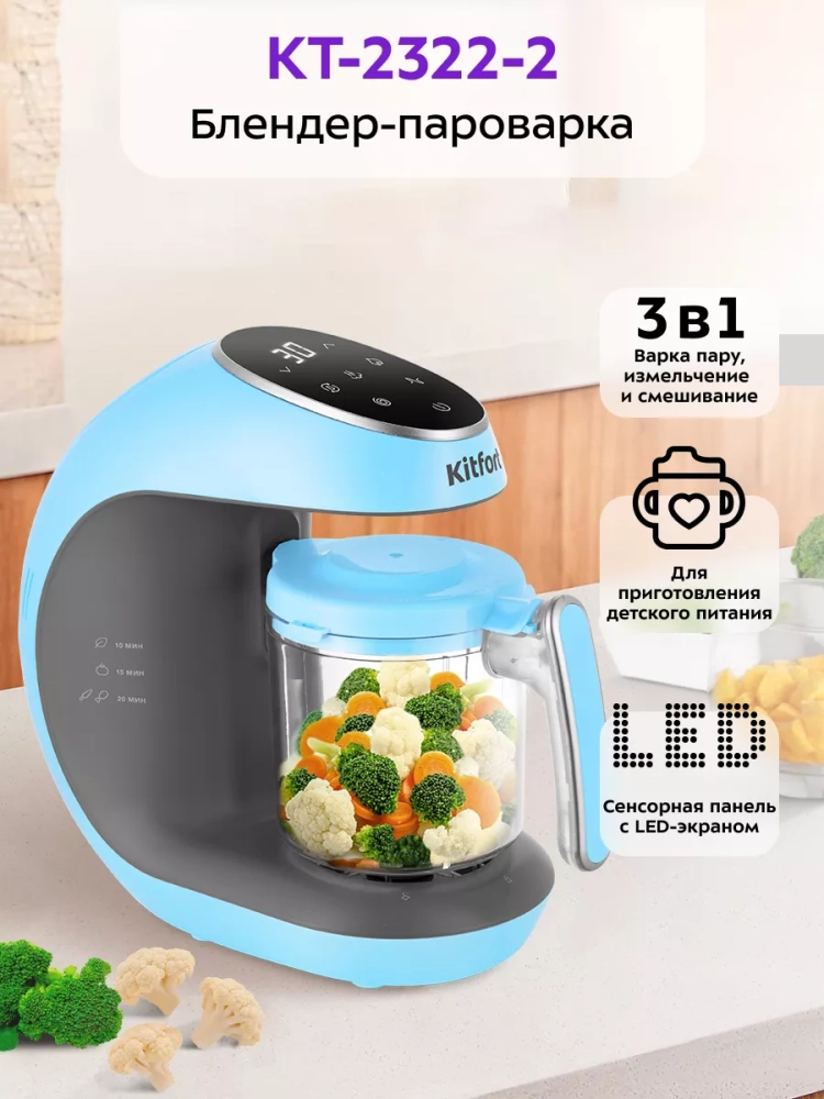 Вкусные и полезные блюда лучше всего готовить на пару — продукты готовятся равномерно и не пригорают, в них сохраняются полезные вещества и витамины. Для прикорма детей до года приготовленную пищу необходимо измельчить до нужной консистенции. Блендер-пароварка Kitfort КТ-2322 идеально подходит для приготовления детского питания: варит на пару, затем измельчает и смешивает. Прибор будет хорошим помощником родителям на кухне и поможет сэкономить время. Благодаря постоянной циркуляции пара в чаше, продукты в корзине равномерно прогреваются и готовятся. По окончании готовки прибор автоматически отключается, поэтому пища не переварится. После варки на пару продукты необходимо переложить из корзины в чашу и измельчить.