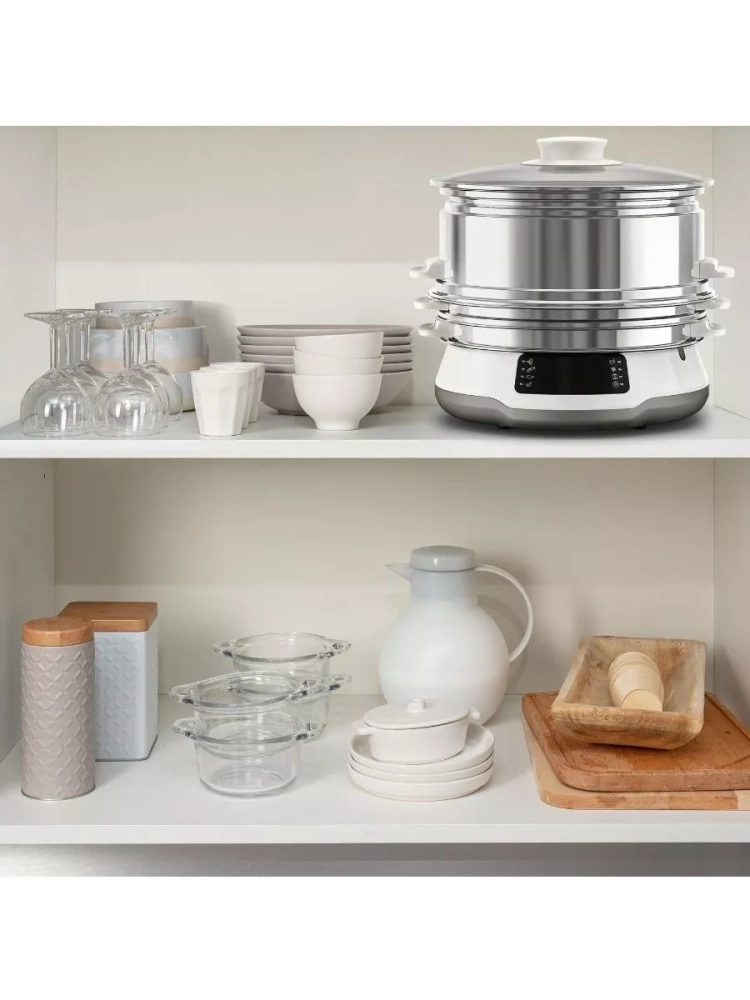 Объемного резервуара для воды хватит на 45 минут, и его можно пополнять прямо в процессе готовки. 8 универсальных программ, 5 настроек для разных ингредиентов (мягкие овощи, твердые овощи, рыба, рис/бобовые, птица), разморозка, разогрев и подогрев – все это на наглядном тачскрине.