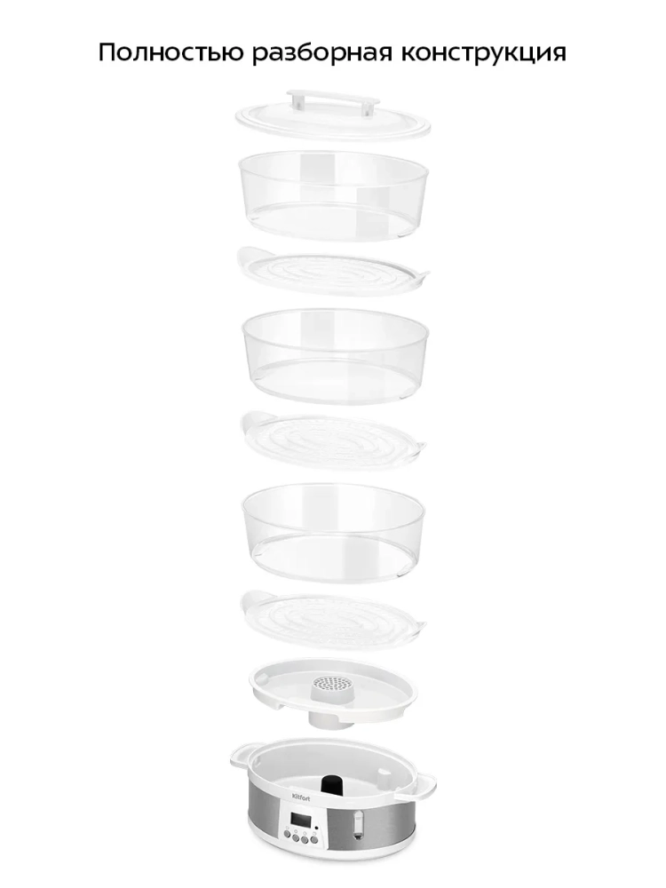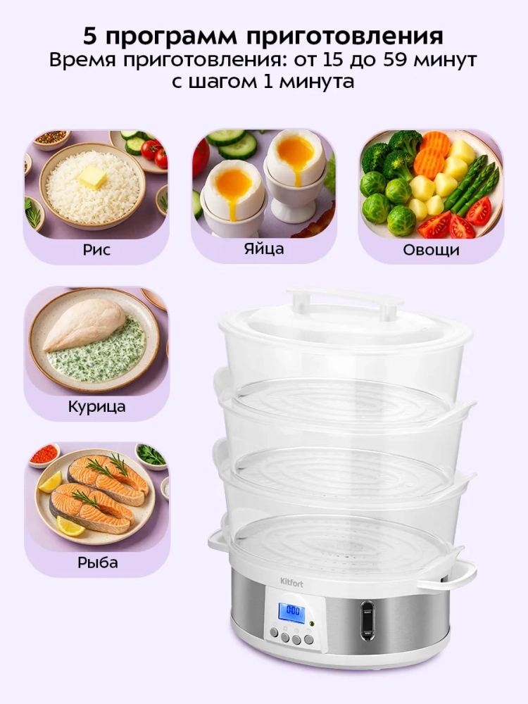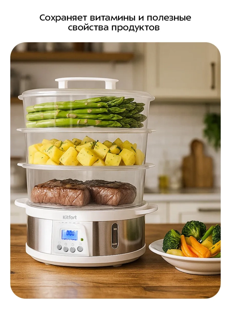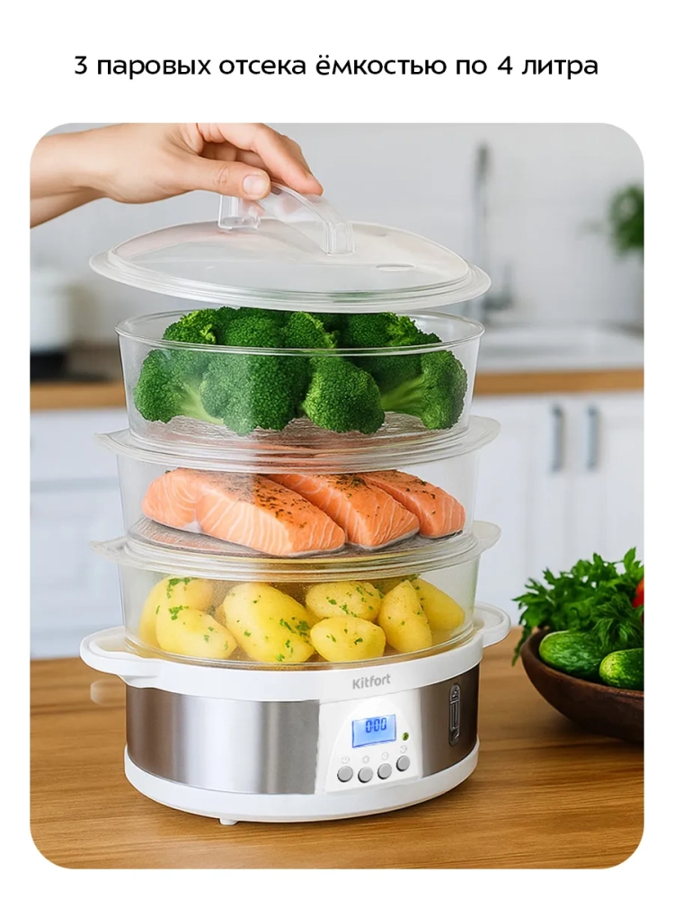 Пароварка Kitfort КТ-6922 приготовит вам вкусные и питательные блюда, сохранив все полезные витамины и микроэлементы, содержащиеся в продуктах. Приготовленные в пароварке продукты получаются нежными, мягкими и сочными. Пароварка станет надежным помощником для всех, кто питается диетическими блюдами и просто заботится о правильности своего питания.