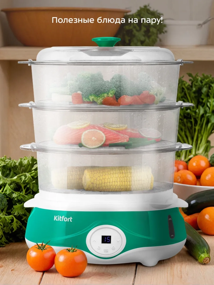 Пароварка Kitfort КТ-6454 приготовит вам вкусные и питательные блюда, сохранив все полезные витамины и микроэлементы, содержащиеся в продуктах. Продукты, приготовленные в пароварке, получаются нежными, мягкими и сочными. Пароварка станет надежным помощником для всех, кто питается диетическими блюдами и просто беспокоится о правильности своего питания.