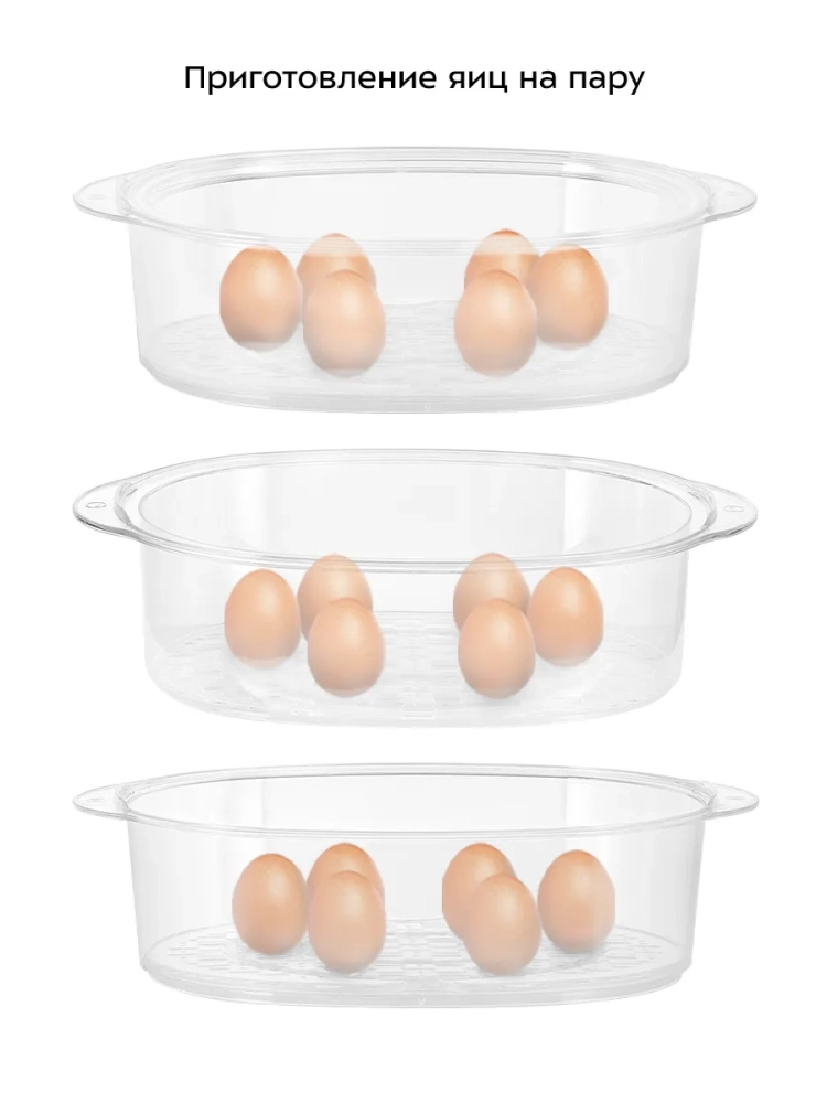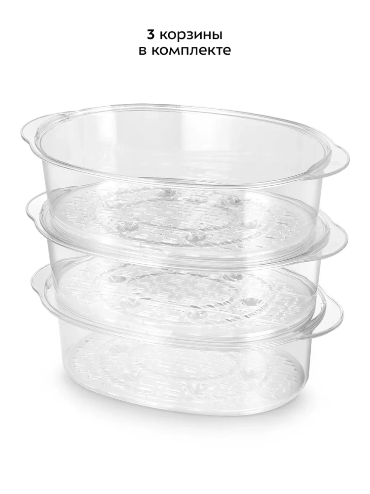 Пароварка оснащена тремя паровыми корзинами, что позволит приготовить обед или ужин из нескольких блюд сразу на всю семью.