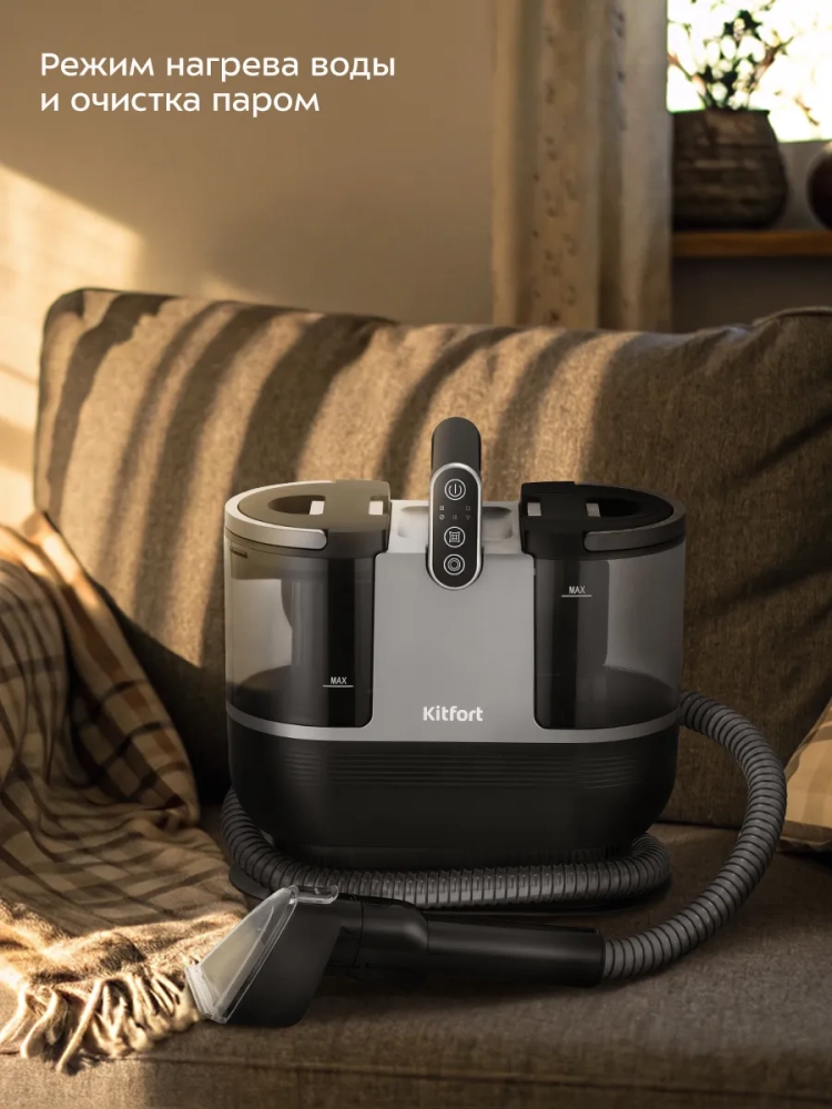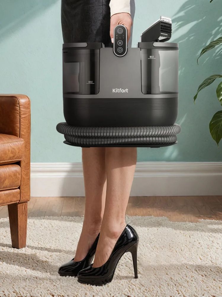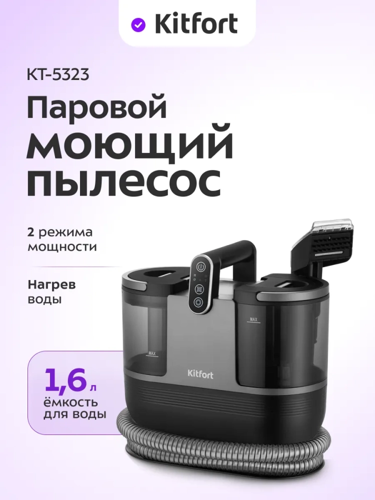 Паровой моющий пылесос для ковров и мягкой мебели Kitfort KT-5323 поможет очистить обивку дивана, кресел, сидений в машине и другой мягкой мебели, а также ковры и ковровые покрытия. Пылесос автоматически подает чистую воду или пар на очищаемую поверхность, а затем всасывает воду с пылью и другими загрязнениями. Пыль и грязь оседают в воде, в резервуаре для грязной воды. В резервуар для чистой воды добавляют воду, для доочистки воды в нем предусмотрен фильтр. Фильтр для воды предотвращает попадание крупных частиц в патрубки, помпу и нагревательный элемент. В резервуаре для грязной воды предусмотрен поплавок, который по мере наполнения резервуара поднимается. Когда резервуар для грязной воды будет наполнен выше максимально допустимого уровня, пылесос отключится и защитит двигатель от попадания влаги.
